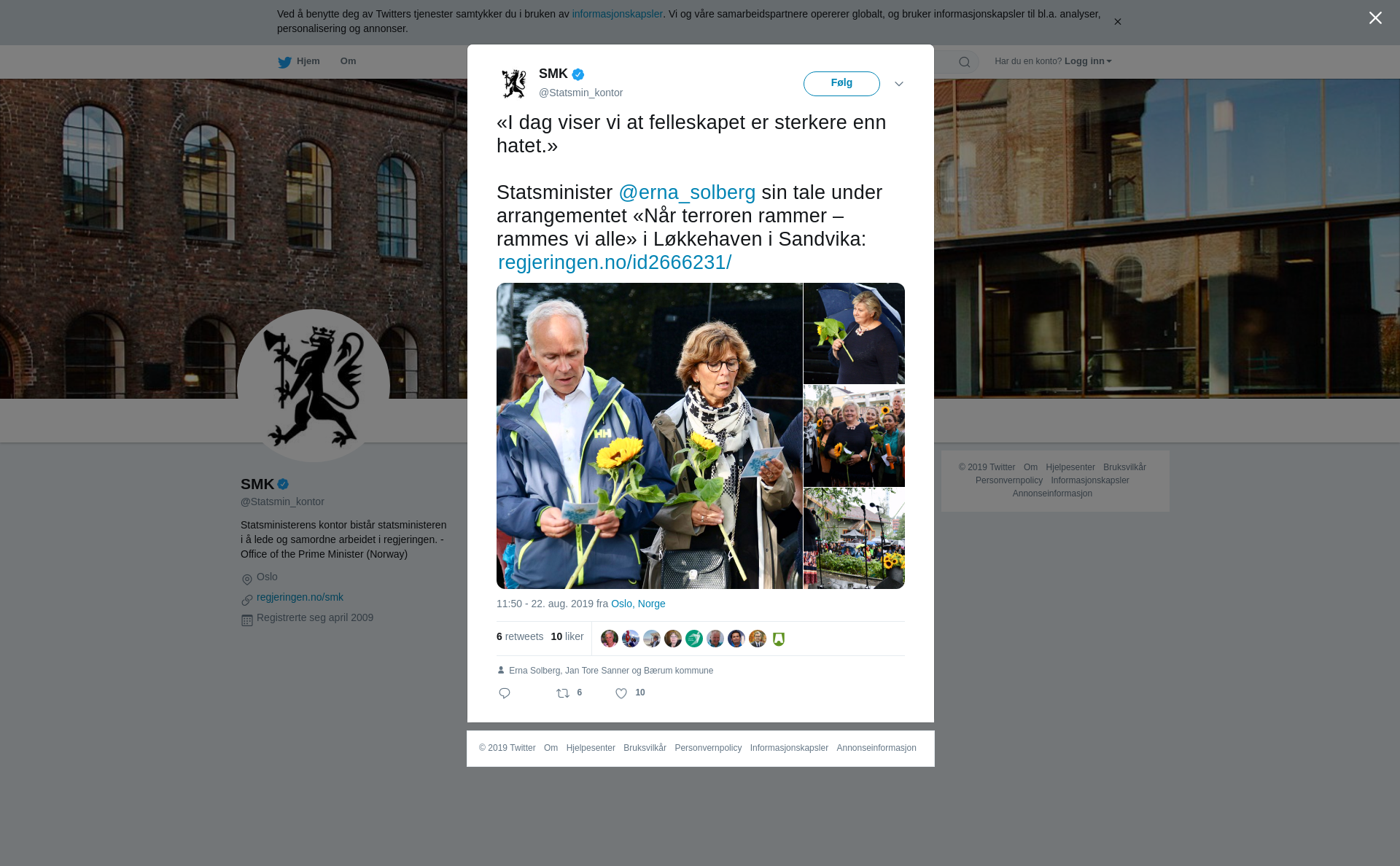RT @Statsmin_kontor: «I dag viser vi at felleskapet er sterkere enn hatet.» Statsminister @erna_solberg sin tale under arrangementet «Når…