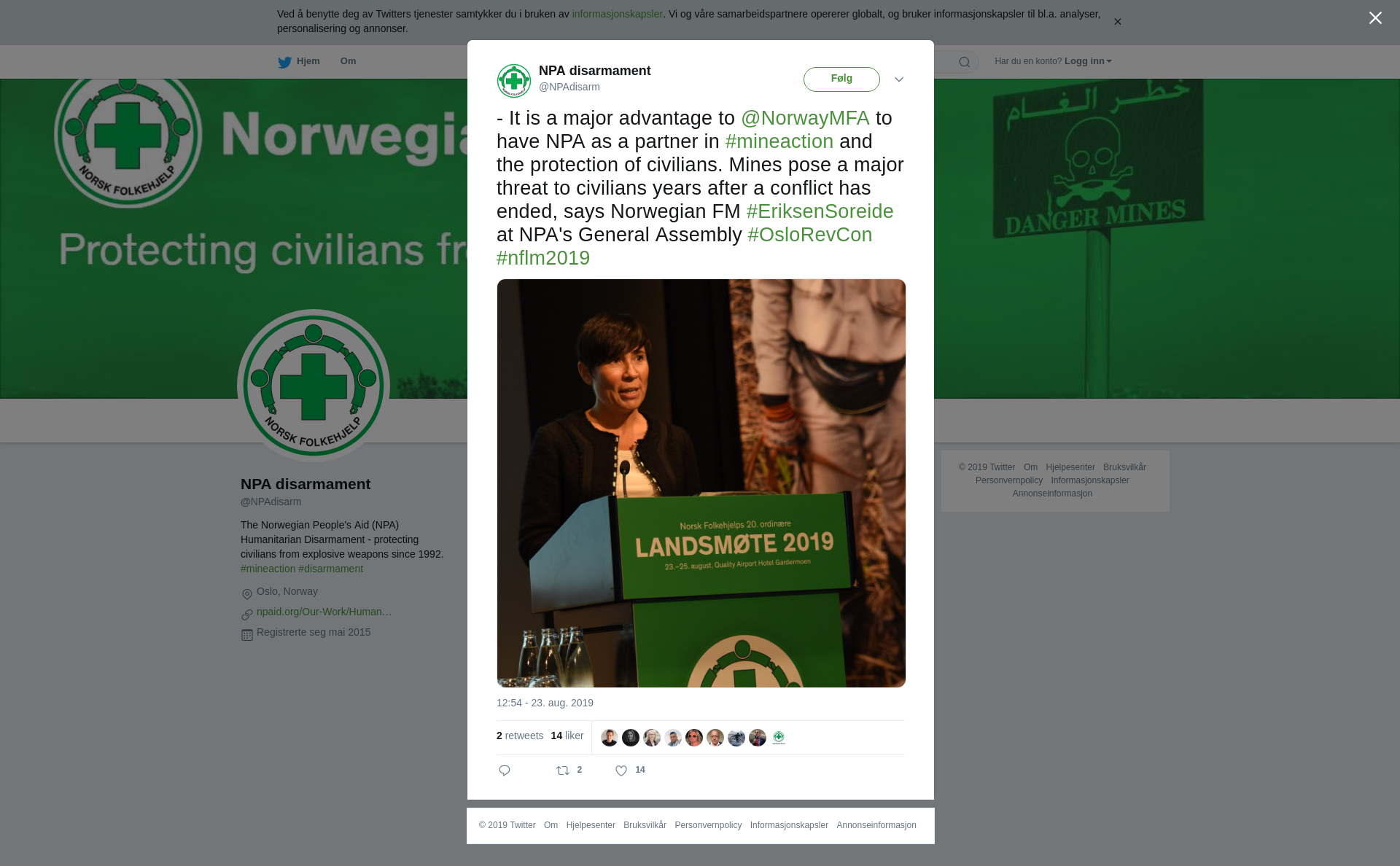 RT @NPAdisarm: - It is a major advantage to @NorwayMFA to have NPA as a partner in #mineaction and the protection of civilians. Mines pose a major threat to civilians years after a conflict has ended, says Norwegian FM #EriksenSoreide at NPA's General Assembly #OsloRevCon #nflm2019 https://t.co/qQdtPcs9p1
