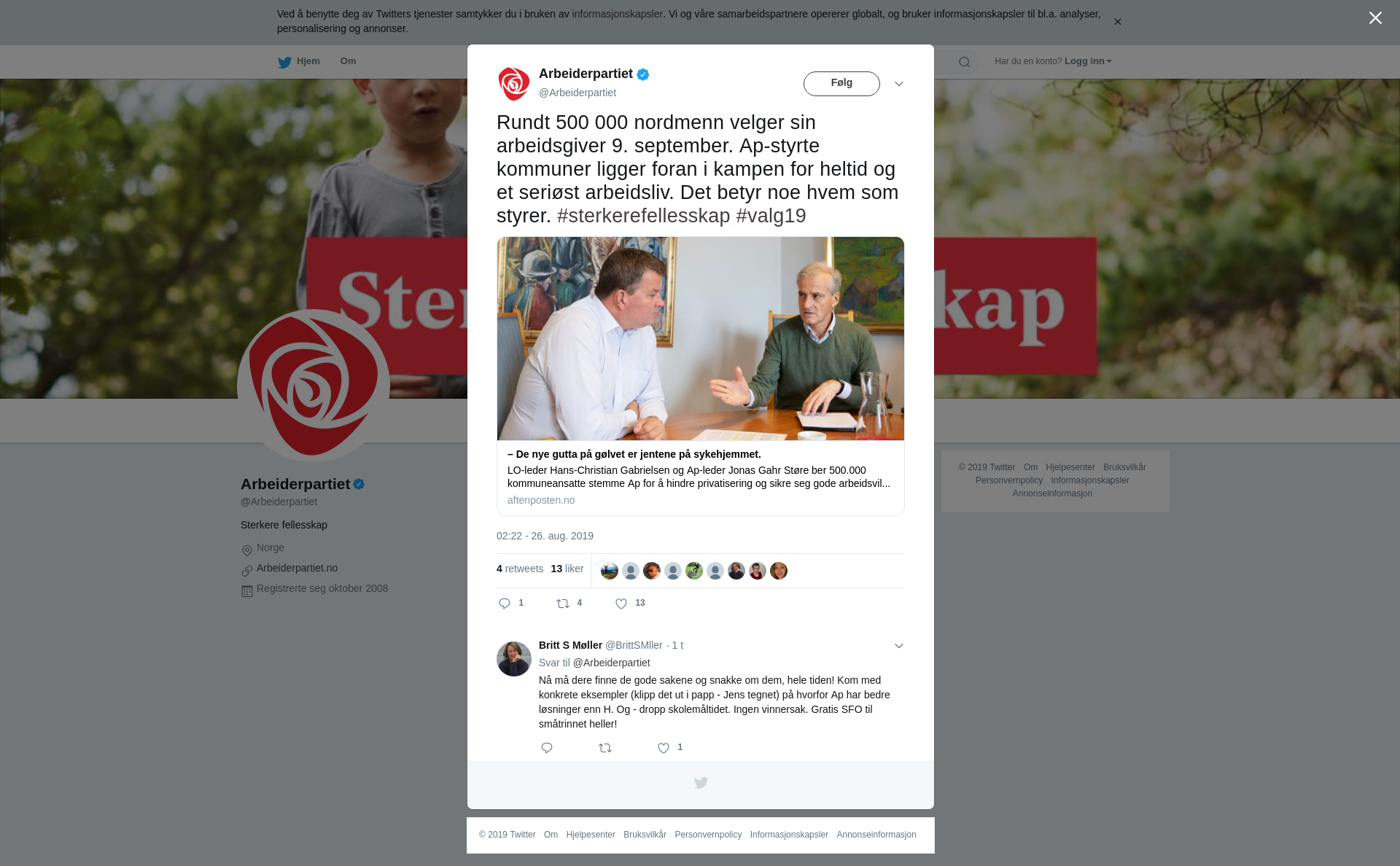 LO-leder Hans-Christian Gabrielsen og Ap-leder Jonas Gahr Støre ber 500.000 kommuneansatte stemme Ap for å hindre privatisering og sikre seg gode arbeidsvilkår. - Tåkelegging, svarer Høyre.