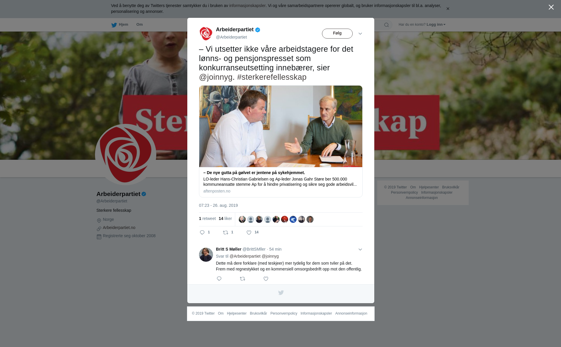 LO-leder Hans-Christian Gabrielsen og Ap-leder Jonas Gahr Støre ber 500.000 kommuneansatte stemme Ap for å hindre privatisering og sikre seg gode arbeidsvilkår. - Tåkelegging, svarer Høyre.
