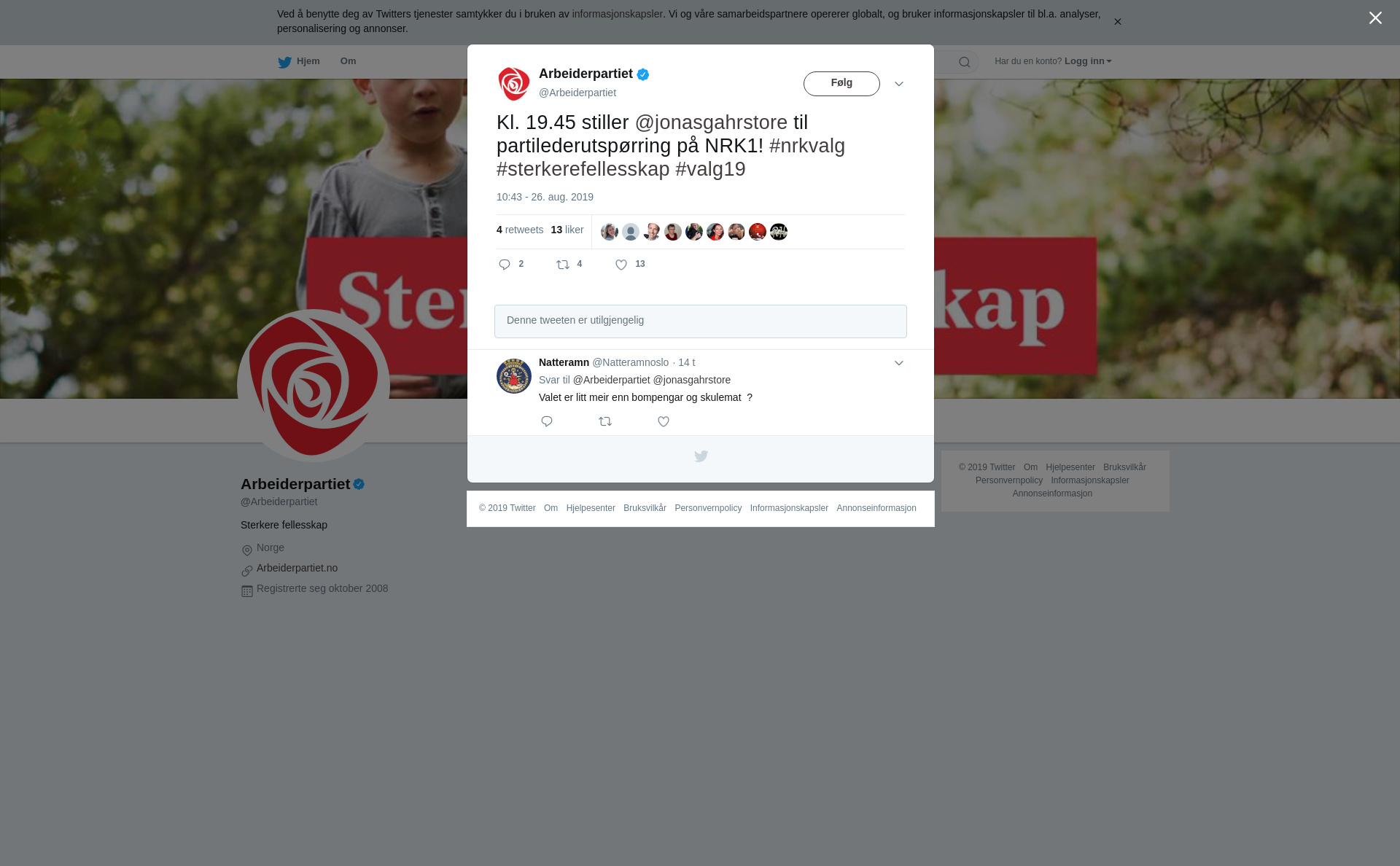 Kl. 19.45 stiller @jonasgahrstore til partilederutspørring på NRK1! #nrkvalg #sterkerefellesskap #valg19