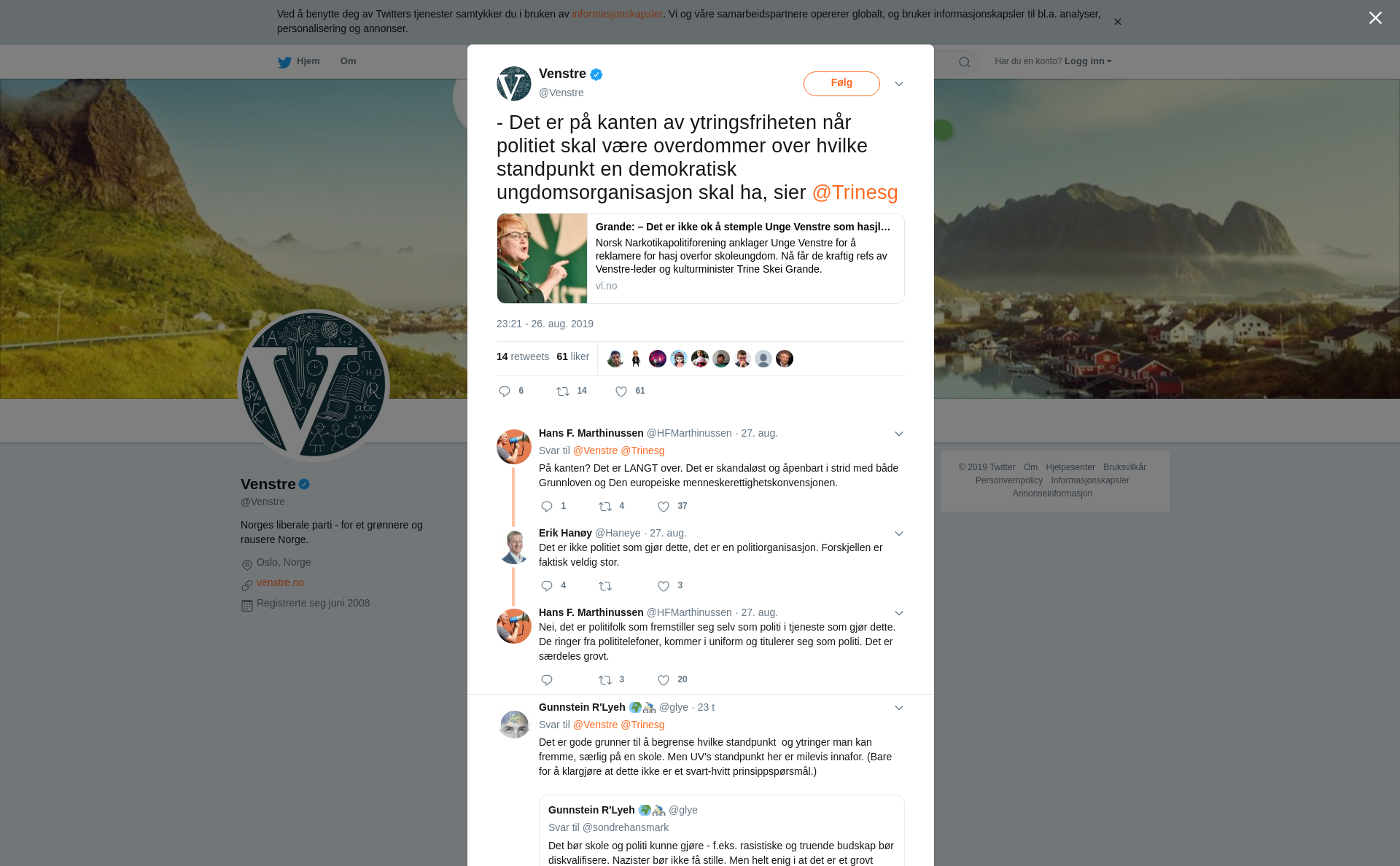 RT @Venstre: - Det er på kanten av ytringsfriheten når politiet skal være overdommer over hvilke standpunkt en demokratisk ungdomsorganisasjon skal ha, sier @Trinesg https://t.co/hPSd1wxKN2