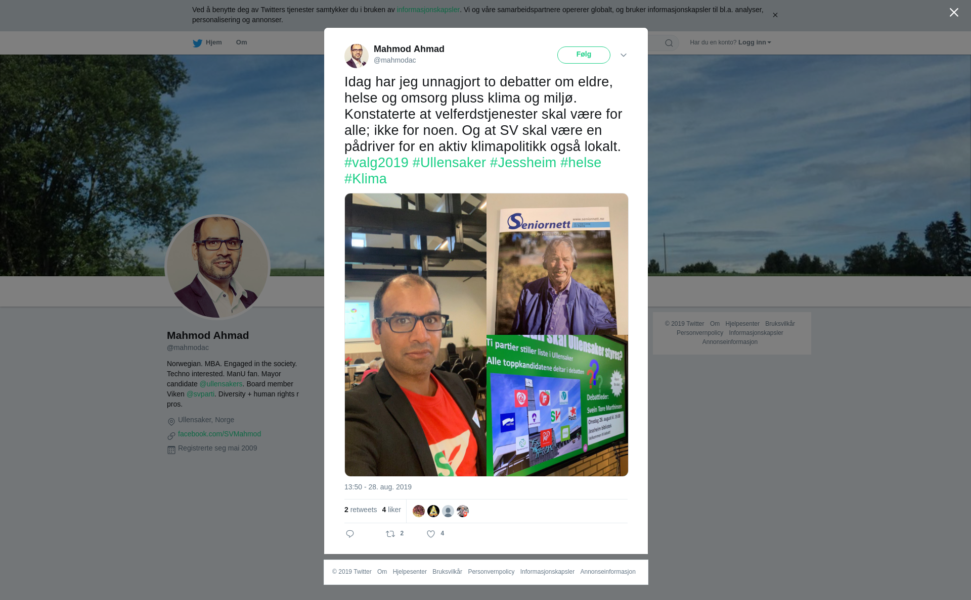 RT @mahmodac: Idag har jeg unnagjort to debatter om eldre, helse og omsorg pluss klima og miljø. Konstaterte at velferdstjenester skal være for alle; ikke for noen. Og at SV skal være en pådriver for en aktiv klimapolitikk også lokalt. #valg2019 #Ullensaker #Jessheim #helse #Klima https://t.co/7Zs1F0Ki37