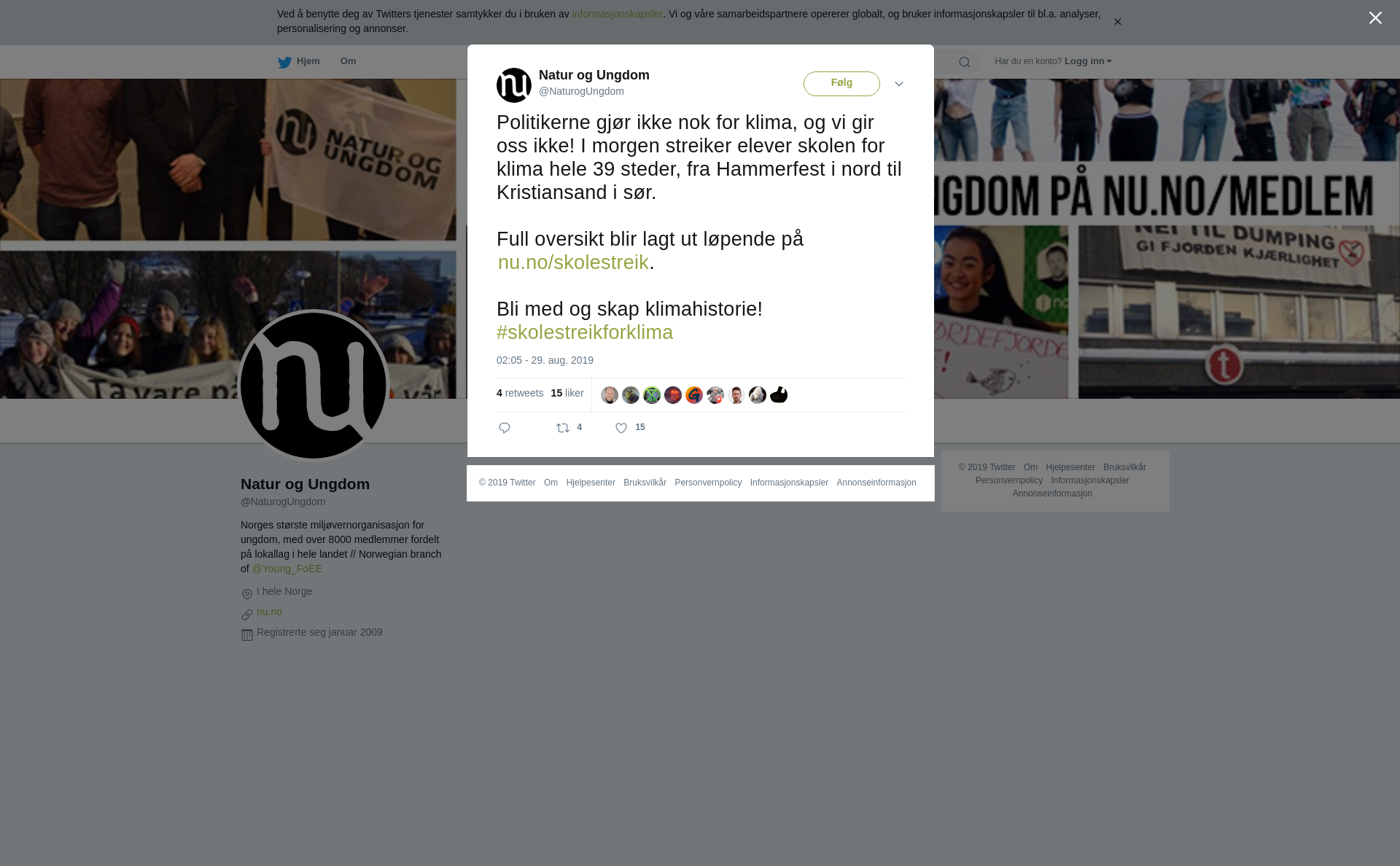RT @NaturogUngdom: Politikerne gjør ikke nok for klima, og vi gir oss ikke! I morgen streiker elever skolen for klima hele 39 steder, fra Hammerfest i nord til Kristiansand i sør.