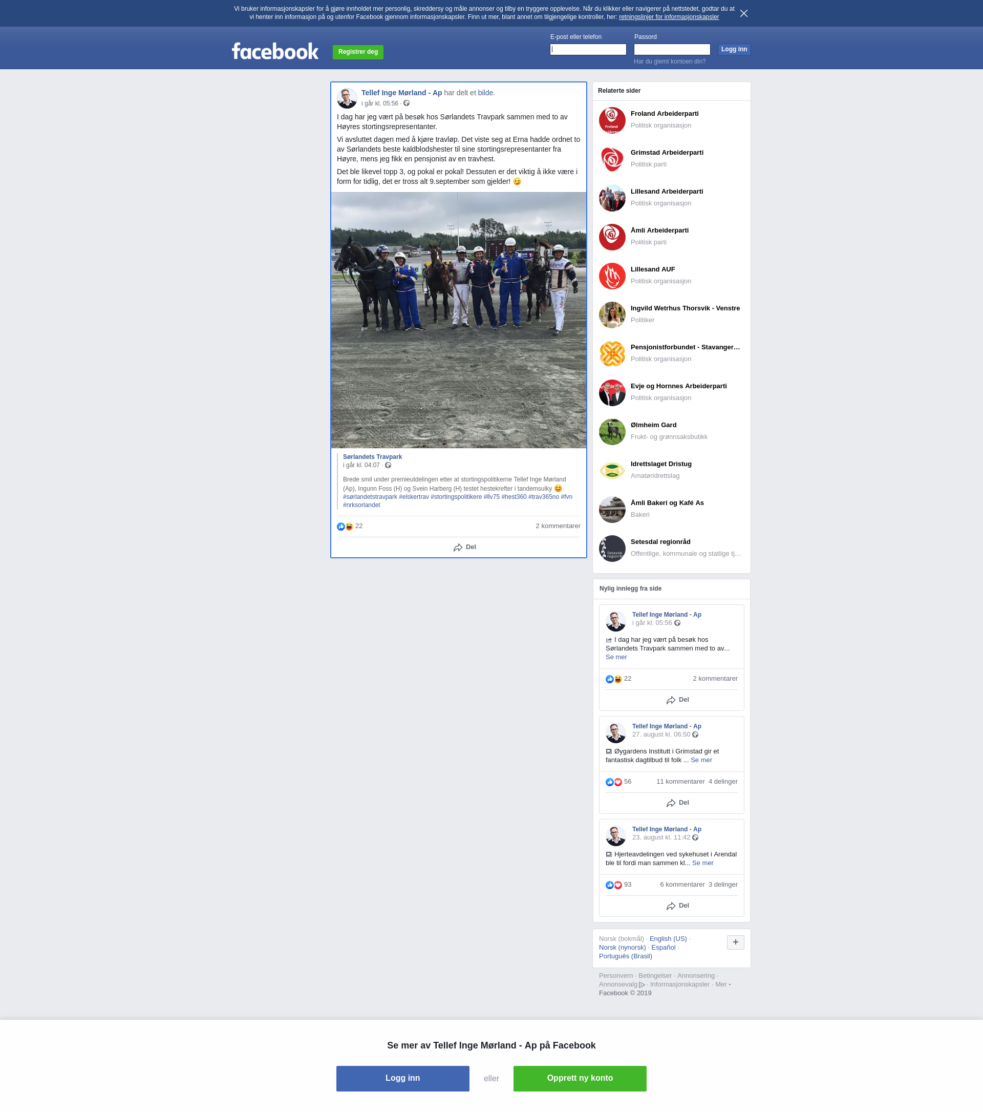 Vi avsluttet dagen med å kjøre travløp. Det viste seg at Erna hadde ordnet to av Sørlandets beste kaldblodshester til sine stortingsrepresentanter fra Høyre, mens jeg fikk en pensjonist av en travhest.