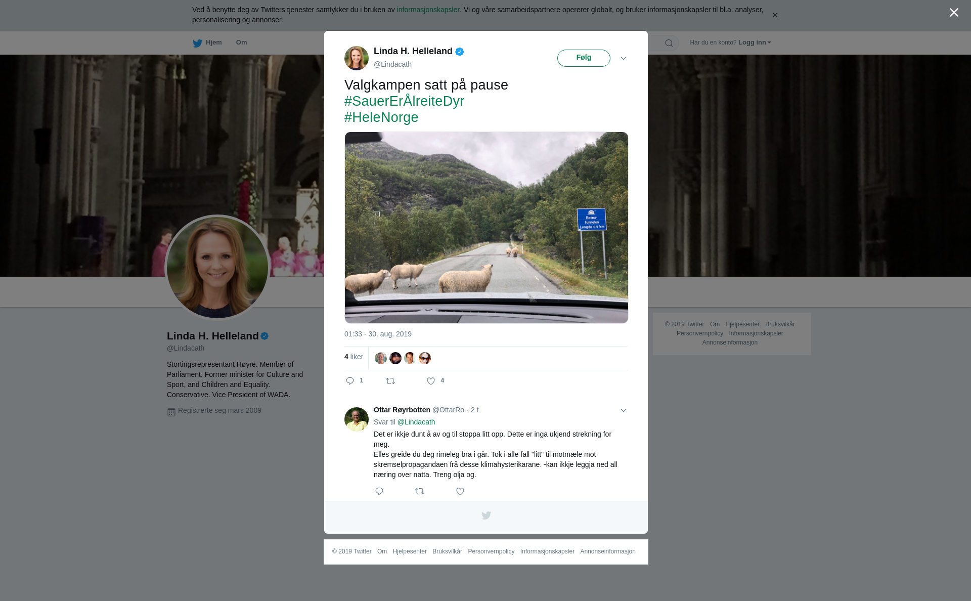 Valgkampen satt på pause #SauerErÅlreiteDyr #HeleNorge https://t.co/ejMYIPru6o