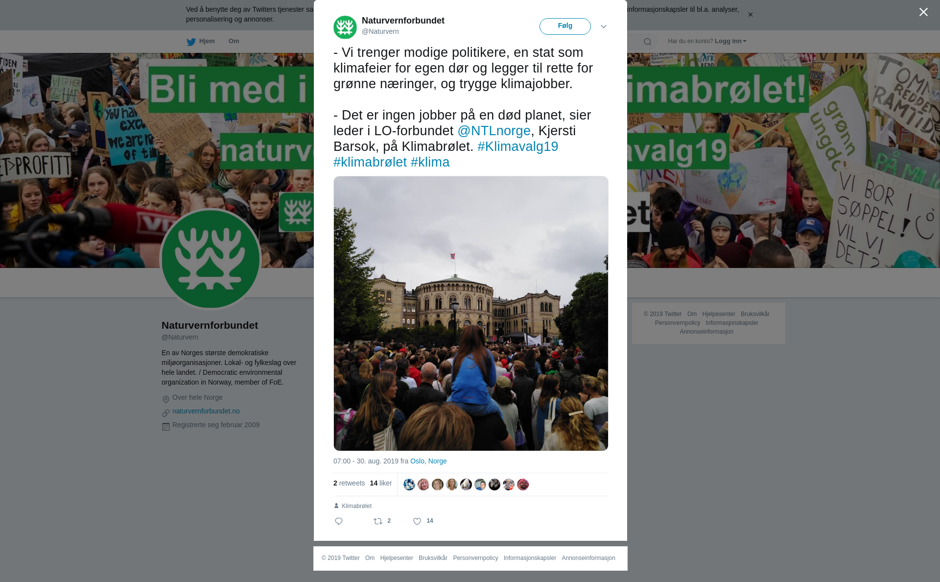 - Det er ingen jobber på en død planet, sier leder i LO-forbundet @NTLnorge, Kjersti Barsok, på Klimabrølet. #Klimavalg19 #klimabrølet #klima https://t.co/cW2wmSKszY