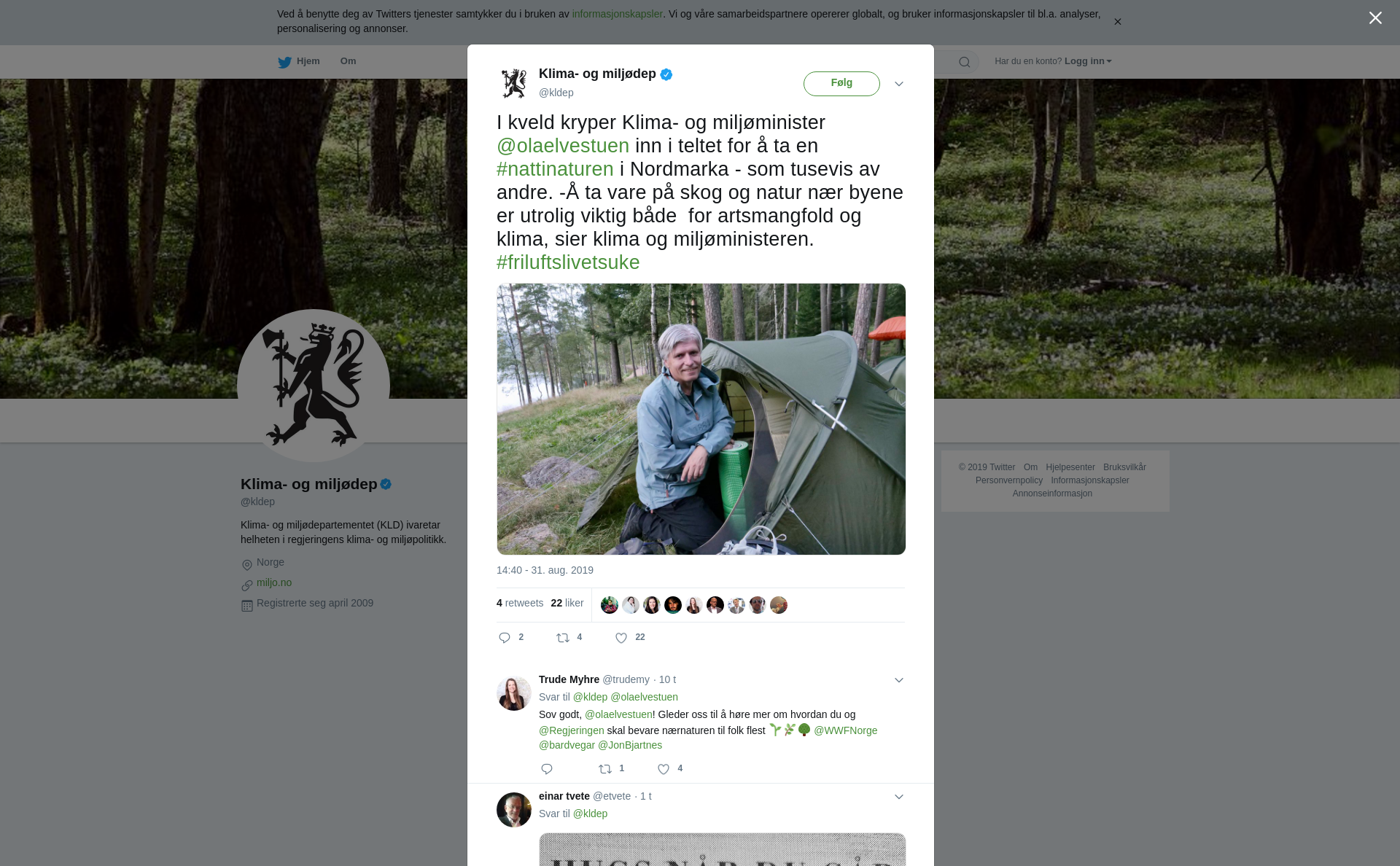 I kveld kryper Klima- og miljøminister @olaelvestuen inn i teltet for å ta en #nattinaturen i Nordmarka - som tusevis av andre. -Å ta vare på skog og natur nær byene er utrolig viktig både for artsmangfold og klima, sier klima og miljøministeren. #friluftslivetsuke https://t.co/lvAfp8Qdpe