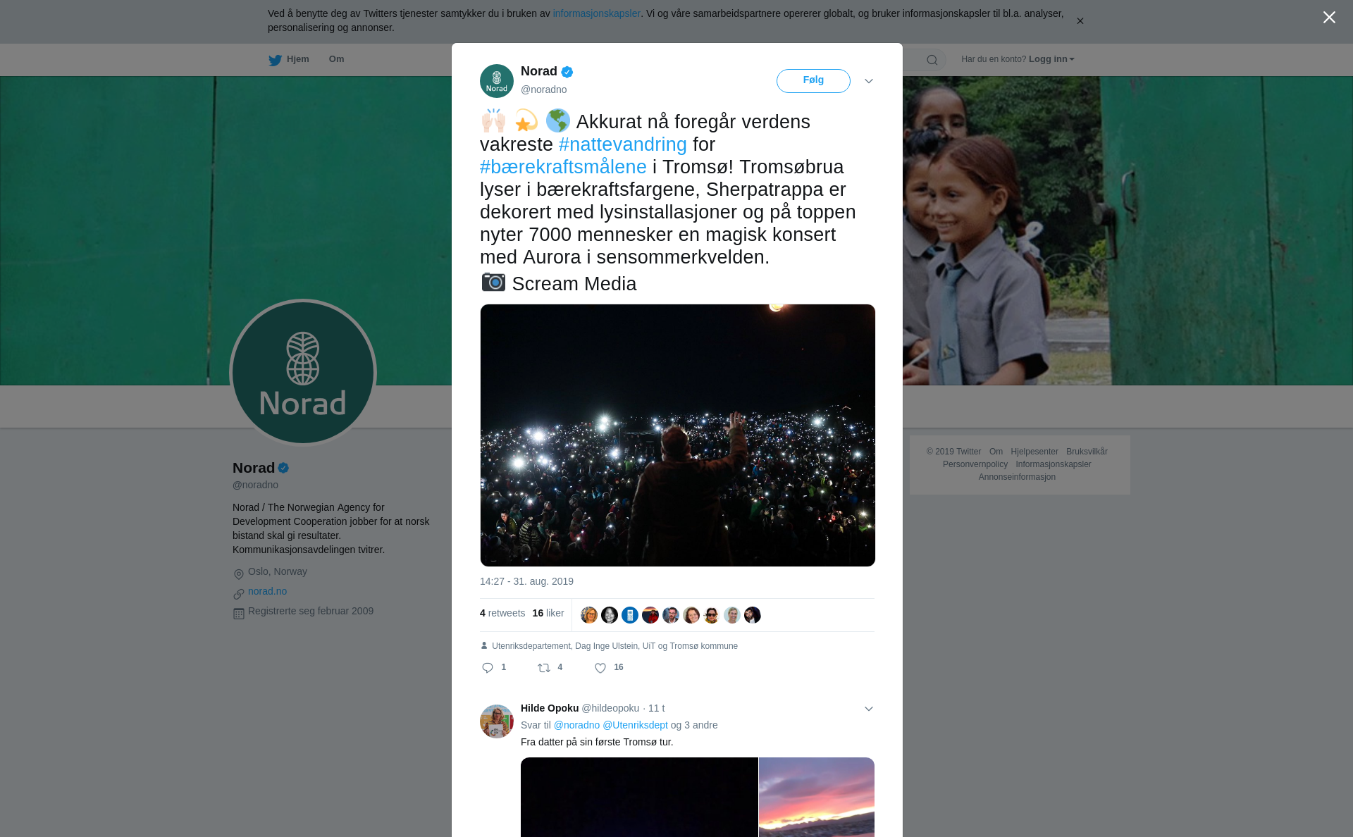 RT @noradno: 🙌🏻 💫 🌎 Akkurat nå foregår verdens vakreste #nattevandring for #bærekraftsmålene i Tromsø! Tromsøbrua lyser i bærekraftsfargene, Sherpatrappa er dekorert med lysinstallasjoner og på toppen nyter 7000 mennesker en magisk konsert med Aurora i sensommerkvelden.