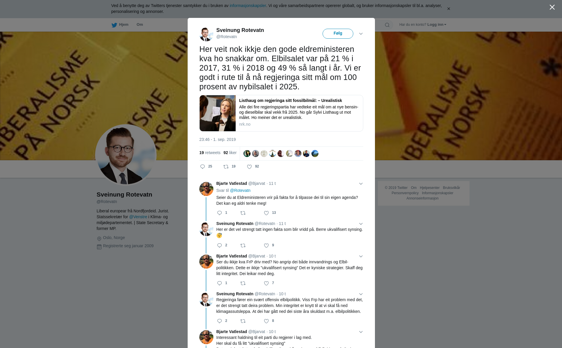 RT @Rotevatn: Her veit nok ikkje den gode eldreministeren kva ho snakkar om. Elbilsalet var på 21 % i 2017, 31 % i 2018 og 49 % så langt i år. Vi er godt i rute til å nå regjeringa sitt mål om 100 prosent av nybilsalet i 2025. https://t.co/BpAKACuyqd