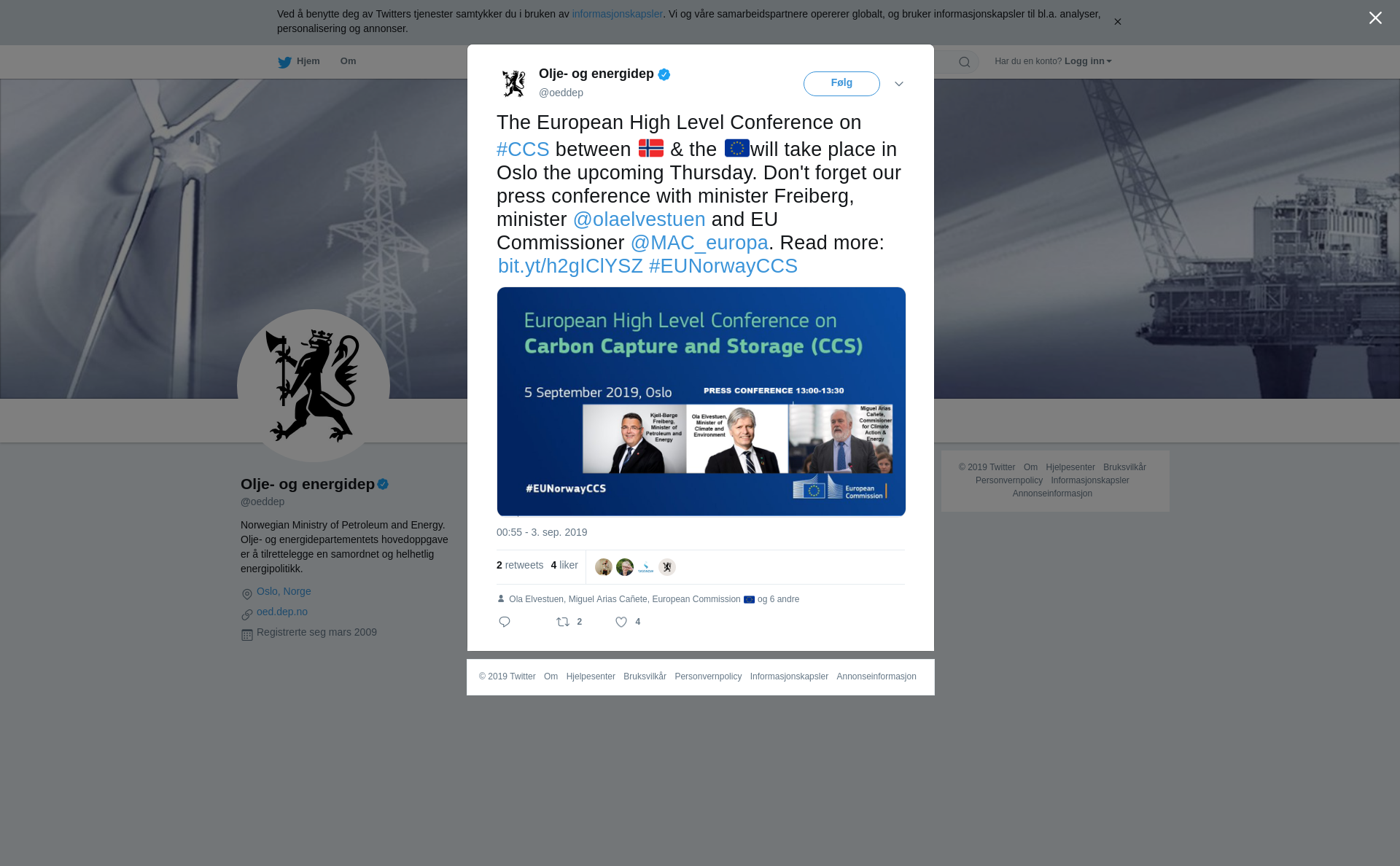 The Ministry of Petroleum and Energy invites to a press conference with EU Commissioner Miguel Arias Cañete, Minister Kjell-Børge Freiberg and Minister Ola Elvestuen in Oslo on September 5th.