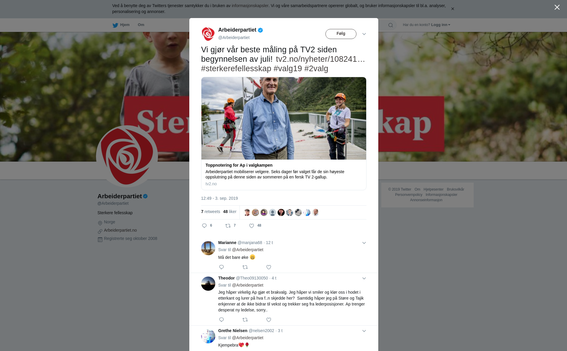 Vi gjør vår beste måling på TV2 siden begynnelsen av juli! https://t.co/8GLQi766li #sterkerefellesskap #valg19 #2valg