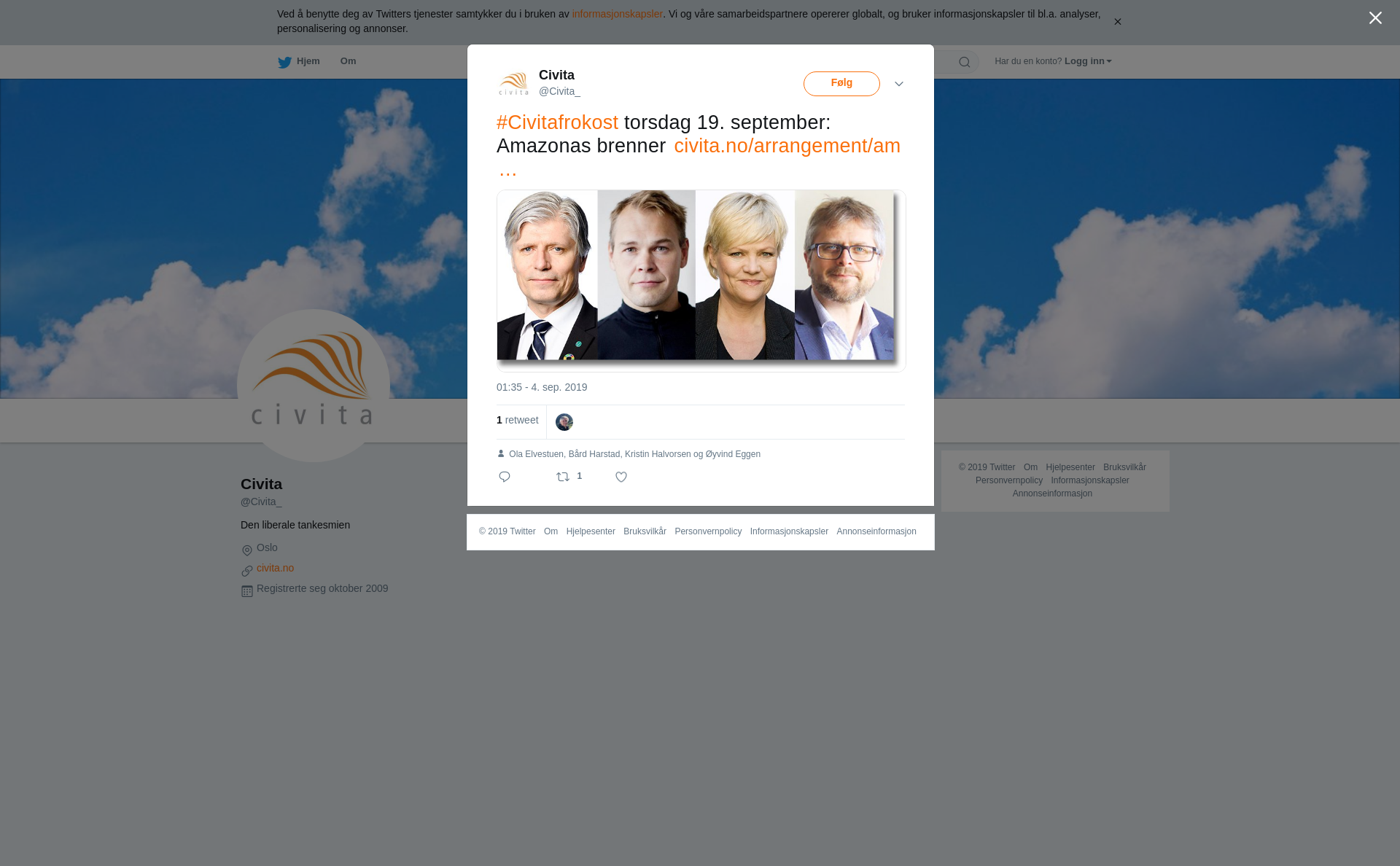 RT @Civita_: #Civitafrokost torsdag 19. september: Amazonas brenner https://t.co/g1UtzsQuiL https://t.co/V0fcvIFjFf