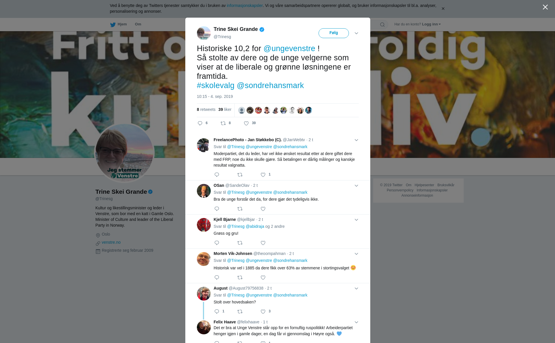 Historiske 10,2 for @ungevenstre ! Så stolte av dere og de unge velgerne som viser at de liberale og grønne løsningene er framtida. #skolevalg @sondrehansmark