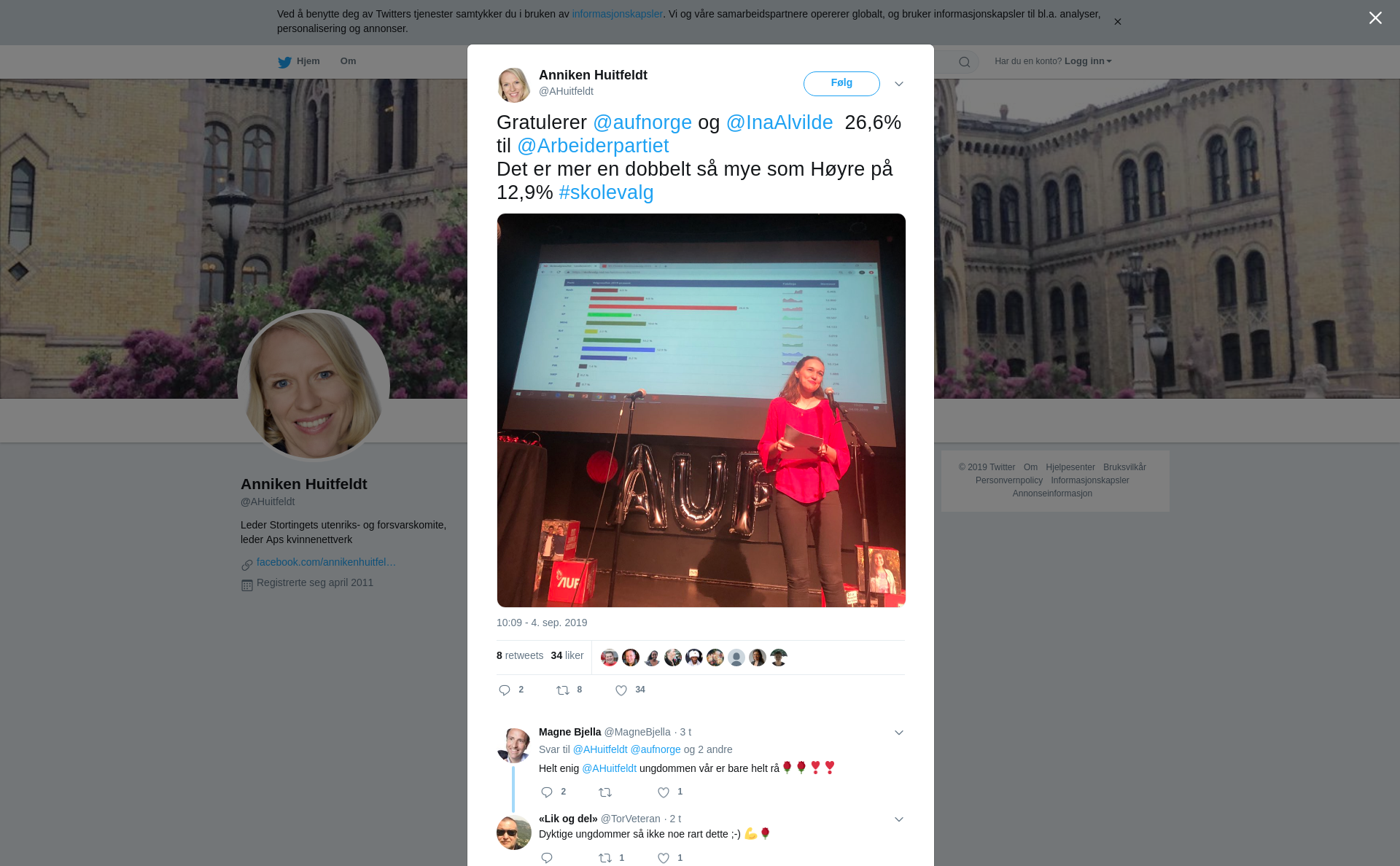 Gratulerer @aufnorge og @InaAlvilde 26,6% til @Arbeiderpartiet Det er mer en dobbelt så mye som Høyre på 12,9% #skolevalg https://t.co/szj9dqe5cj