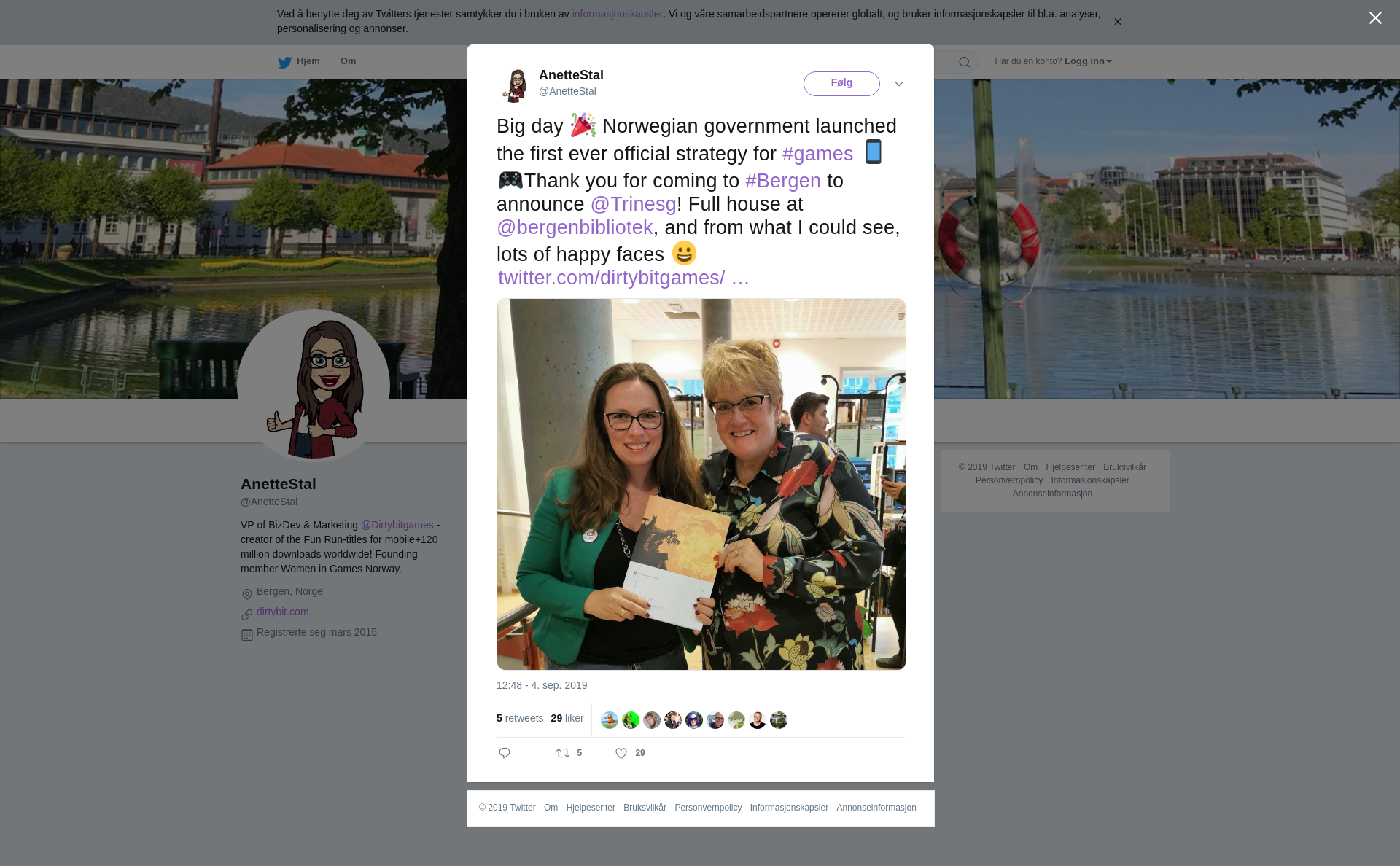 RT @AnetteStal: Big day 🎉 Norwegian government launched the first ever official strategy for #games 📱🎮Thank you for coming to #Bergen to announce @Trinesg! Full house at @bergenbibliotek, and from what I could see, lots of happy faces 😀 https://t.co/d6OGhbhKC9 https://t.co/IsgbVCNJPG