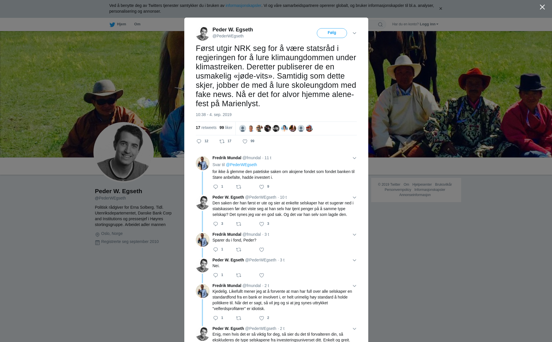 RT @PederWEgseth: Først utgir NRK seg for å være statsråd i regjeringen for å lure klimaungdommen under klimastreiken. Deretter publiserer de en usmakelig «jøde-vits». Samtidig som dette skjer, jobber de med å lure skoleungdom med fake news. Nå er det for alvor hjemme alene-fest på Marienlyst.