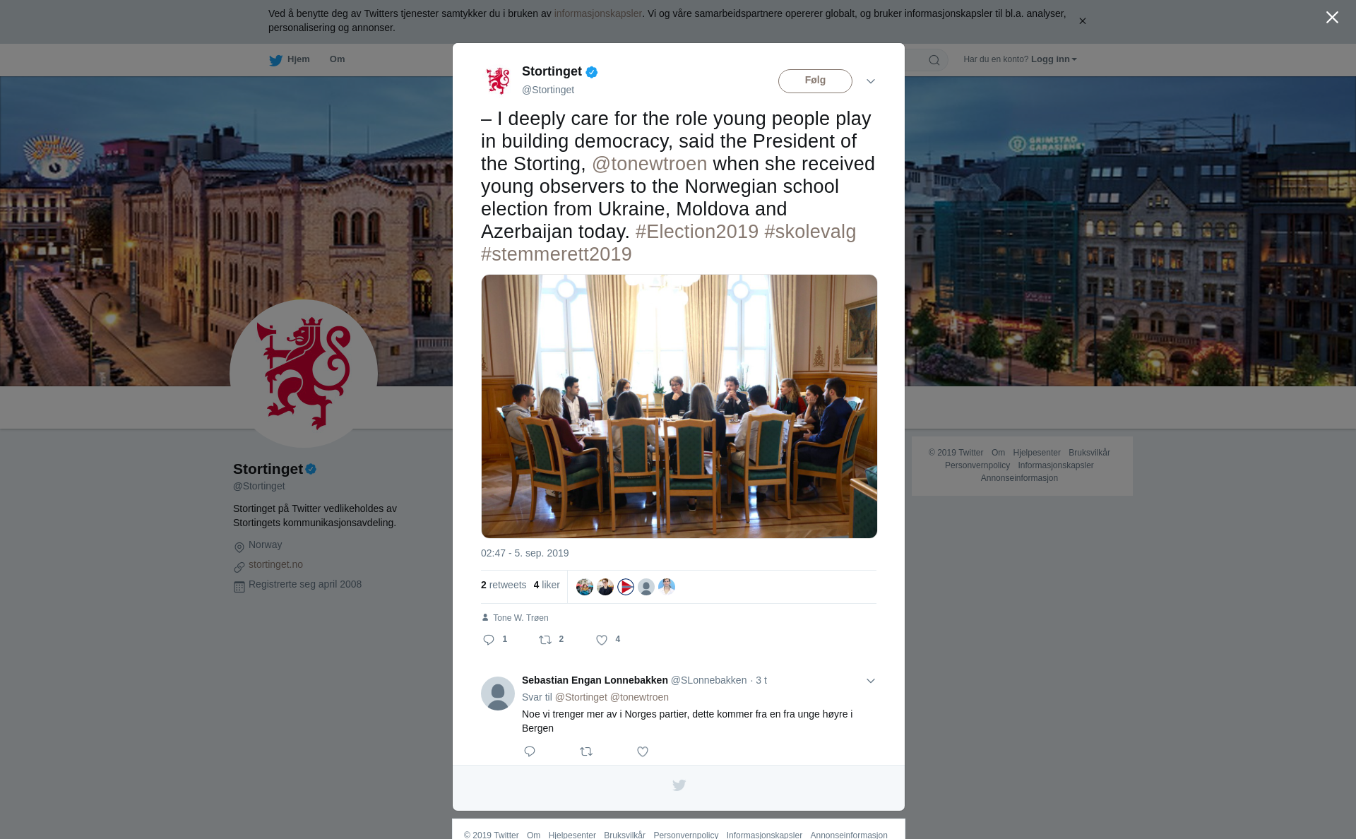 RT @Stortinget: – I deeply care for the role young people play in building democracy, said the President of the Storting, @tonewtroen when she received young observers to the Norwegian school election from Ukraine, Moldova and Azerbaijan today. #Election2019 #skolevalg #stemmerett2019 https://t.co/aD7INqaNUy