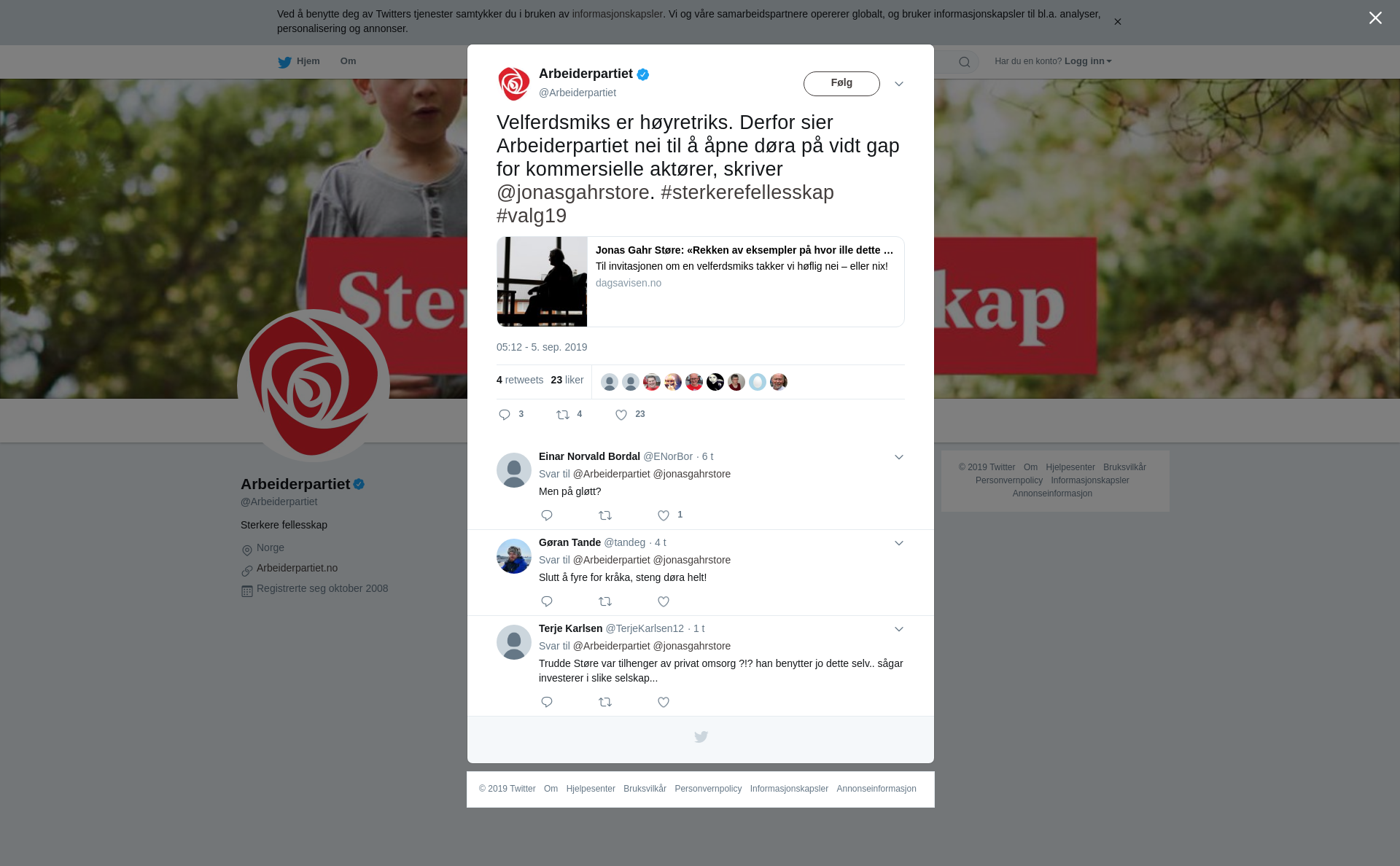 RT @Arbeiderpartiet: Velferdsmiks er høyretriks. Derfor sier Arbeiderpartiet nei til å åpne døra på vidt gap for kommersielle aktører, skriver @jonasgahrstore. #sterkerefellesskap #valg19 https://t.co/SoJqdWtoOx