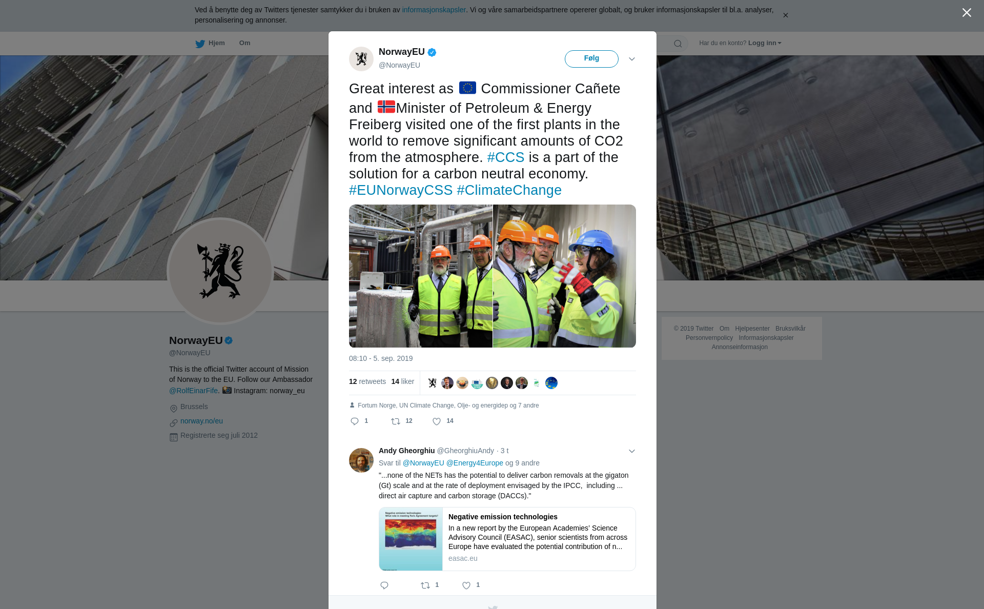RT @NorwayEU: Great interest as 🇪🇺 Commissioner Cañete and 🇳🇴Minister of Petroleum & Energy Freiberg visited one of the first plants in the world to remove significant amounts of CO2 from the atmosphere. #CCS is a part of the solution for a carbon neutral economy. #EUNorwayCSS #ClimateChange https://t.co/7mTVMiyDdJ