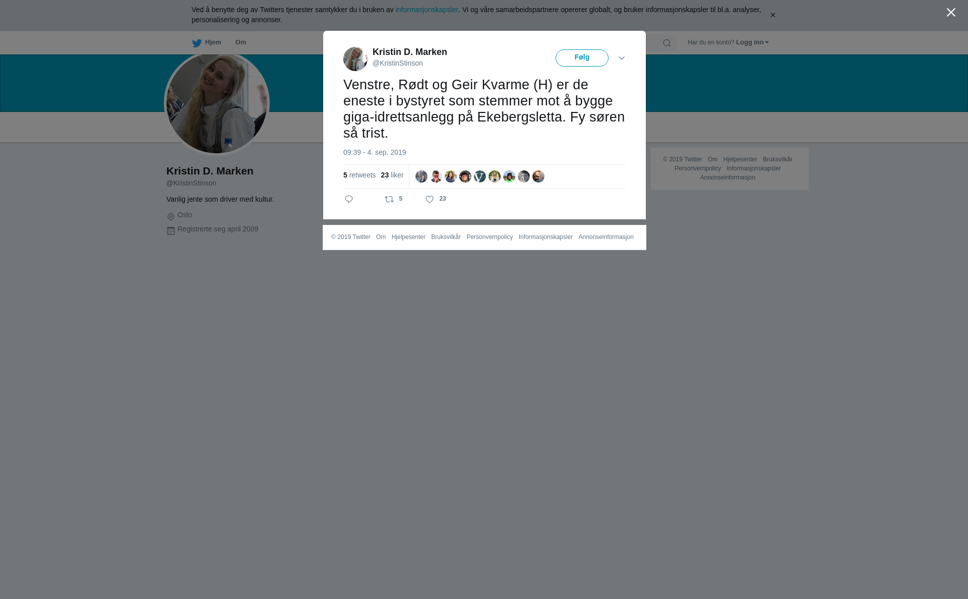 RT @KristinStinson: Venstre, Rødt og Geir Kvarme (H) er de eneste i bystyret som stemmer mot å bygge giga-idrettsanlegg på Ekebergsletta. Fy søren så trist.