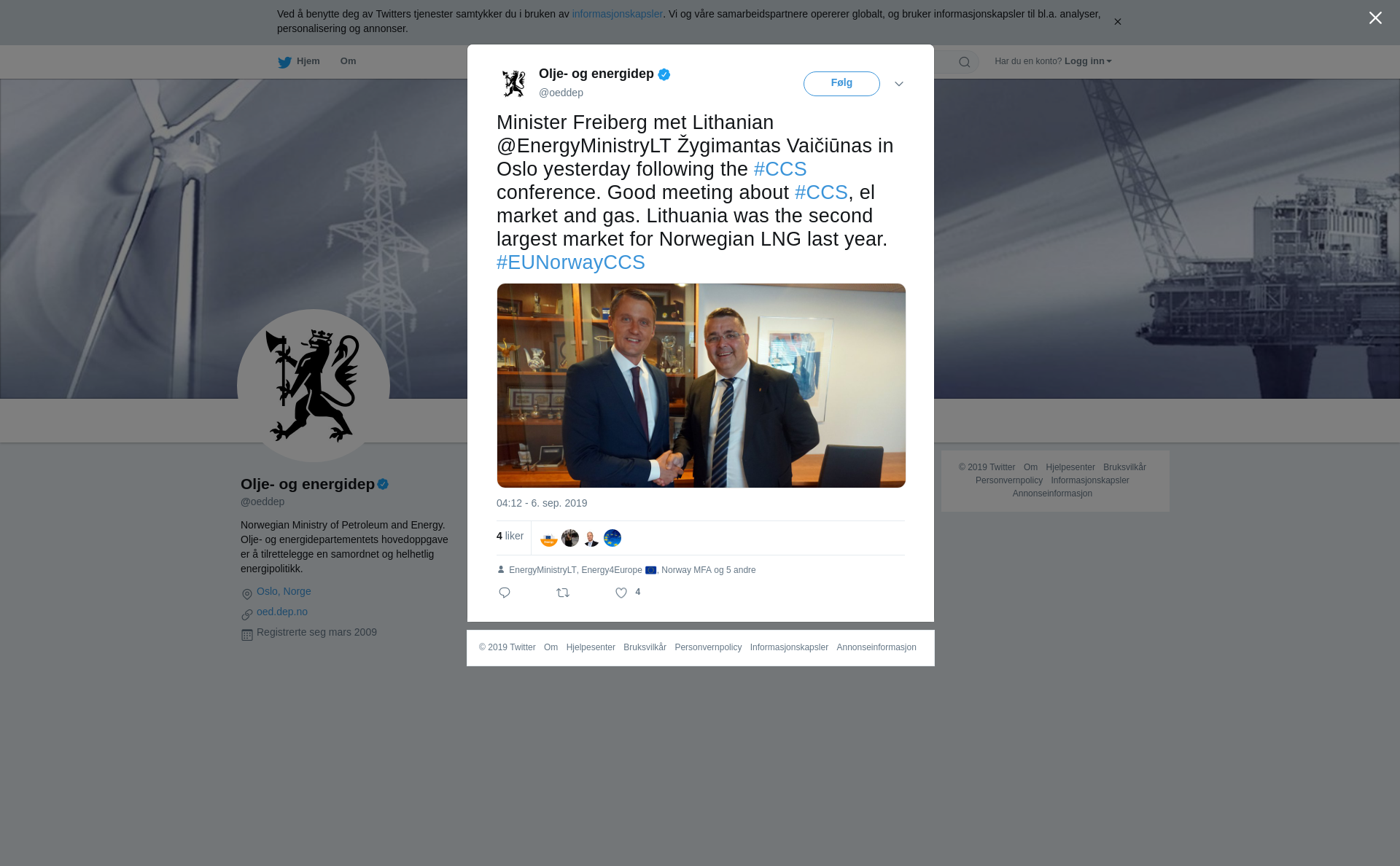 Minister Freiberg met Lithanian @EnergyMinistryLT Žygimantas Vaičiūnas in Oslo yesterday following the #CCS conference. Good meeting about #CCS, el market and gas. Lithuania was the second largest market for Norwegian LNG last year. #EUNorwayCCS https://t.co/JjTpncKIc3