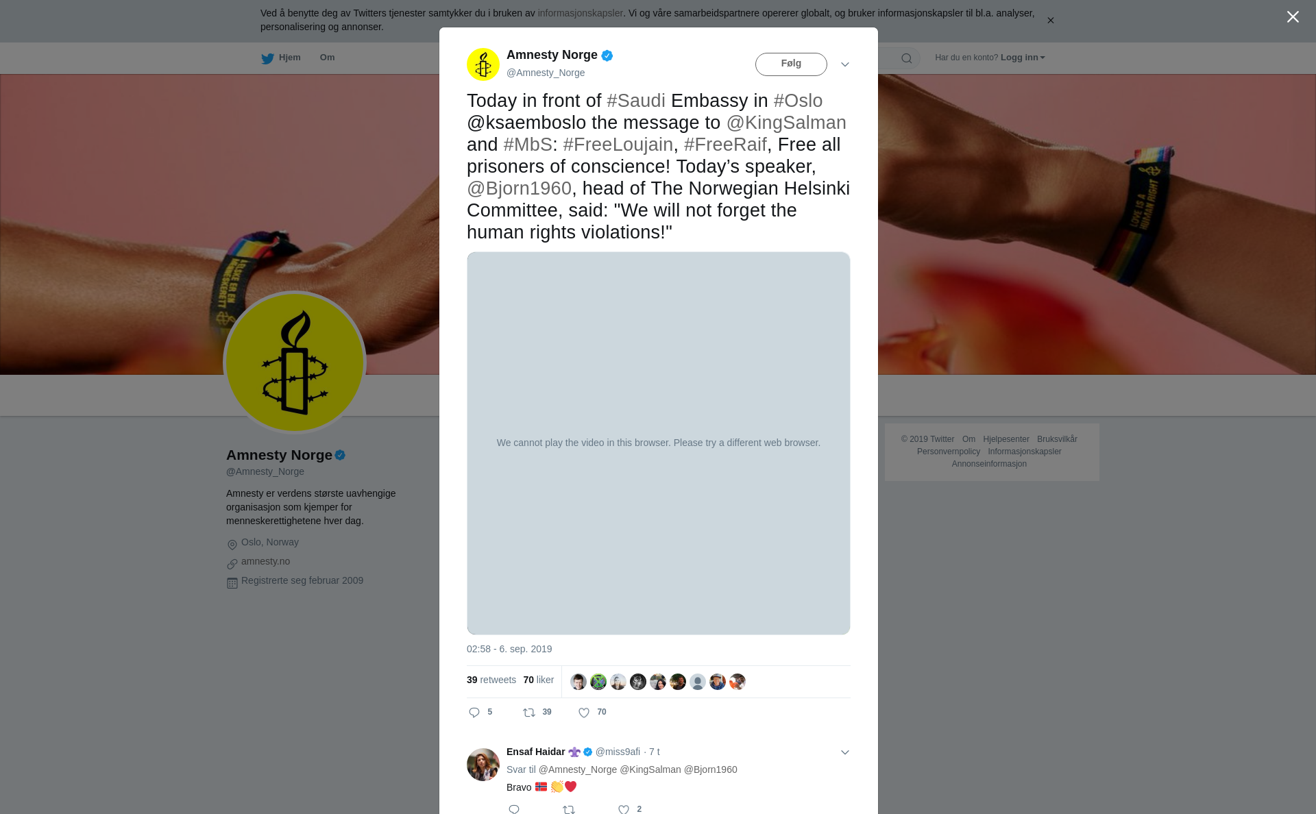 RT @Amnesty_Norge: Today in front of #Saudi Embassy in #Oslo @ksaemboslo the message to @KingSalman and #MbS: #FreeLoujain, #FreeRaif, Free all prisoners of conscience! Today’s speaker, @Bjorn1960, head of The Norwegian Helsinki Committee, said: "We will not forget the human rights violations!" https://t.co/256PghZSGl