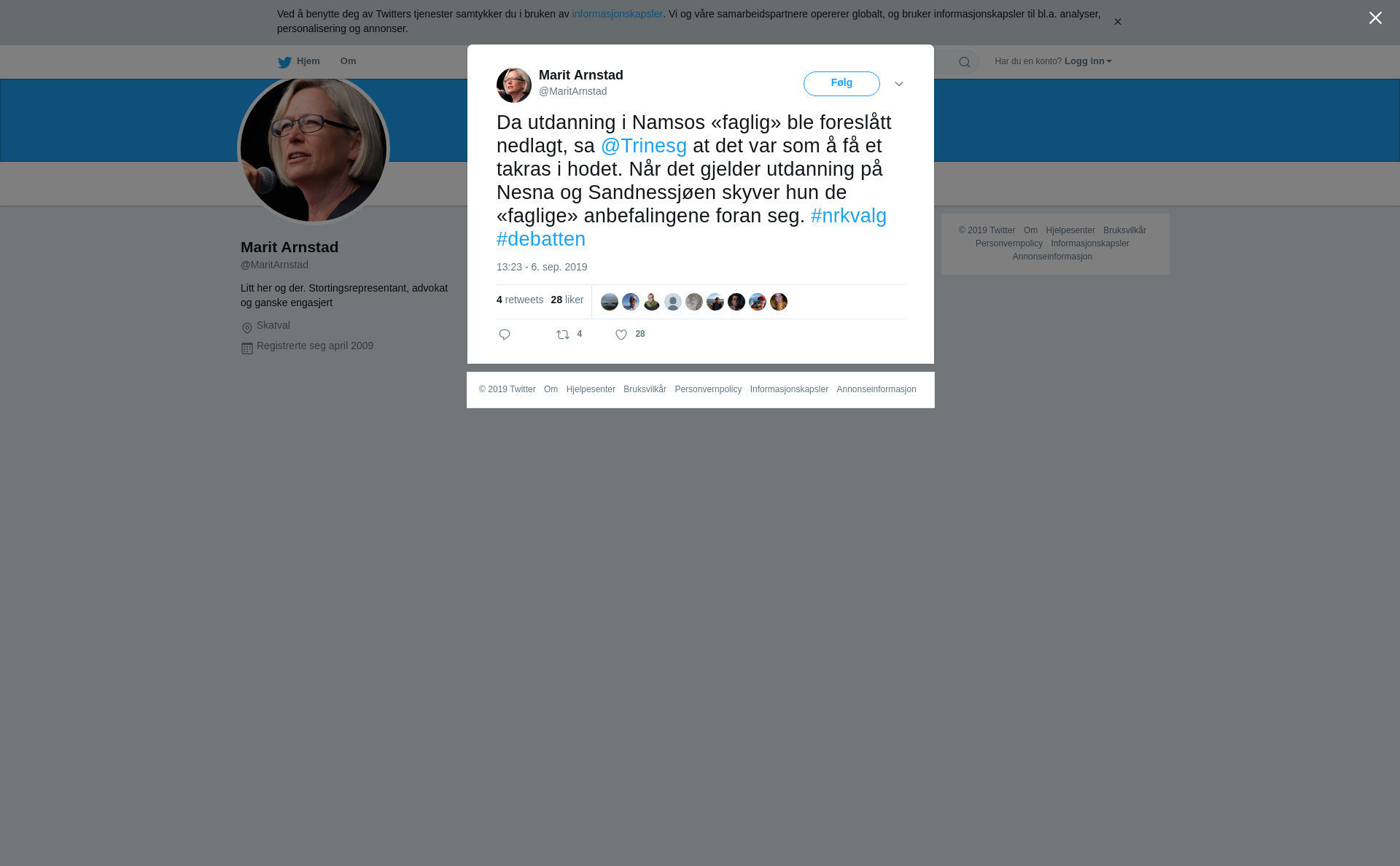 Da utdanning i Namsos «faglig» ble foreslått nedlagt, sa @Trinesg at det var som å få et takras i hodet. Når det gjelder utdanning på Nesna og Sandnessjøen skyver hun de «faglige» anbefalingene foran seg. #nrkvalg #debatten