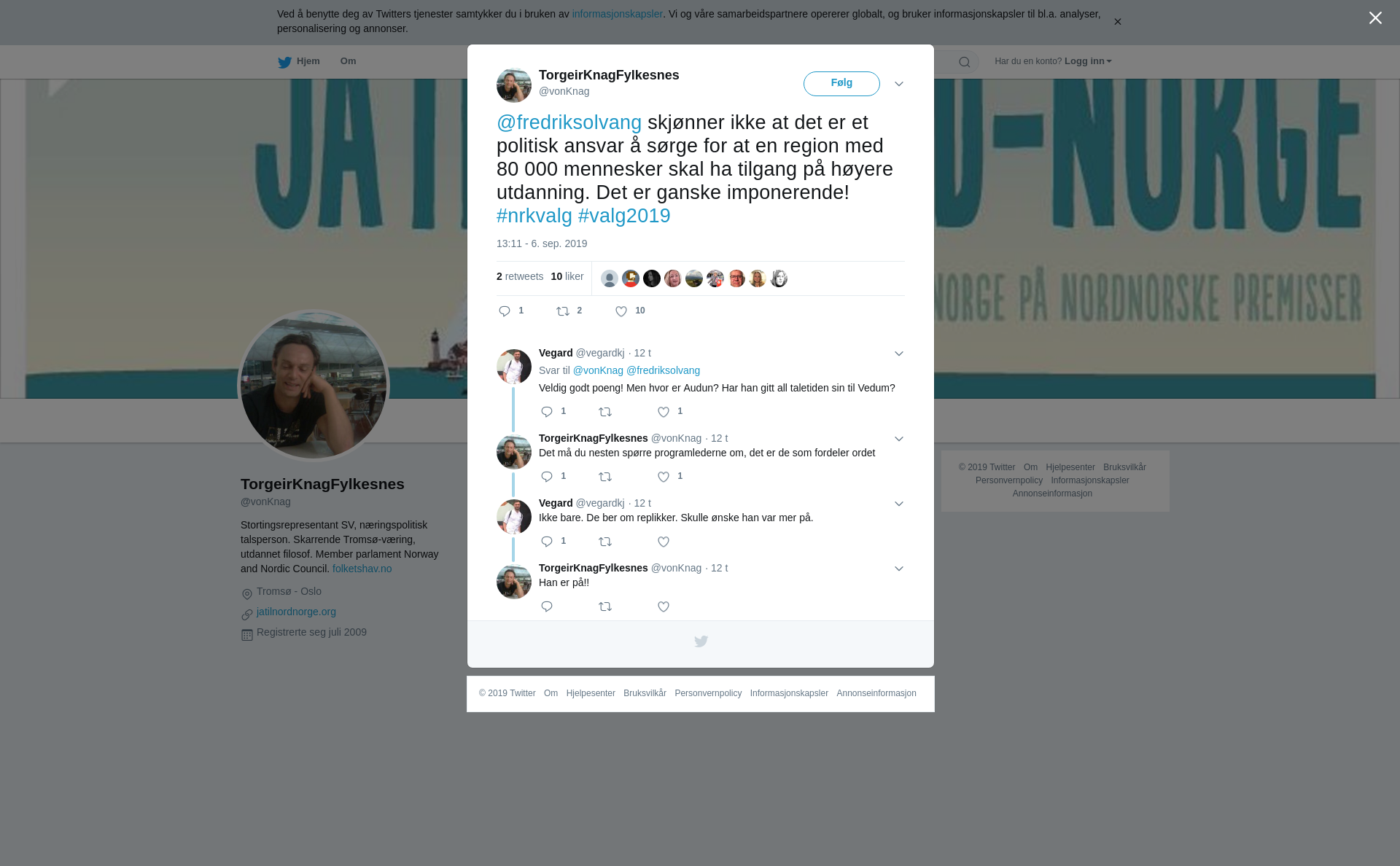 @fredriksolvang skjønner ikke at det er et politisk ansvar å sørge for at en region med 80 000 mennesker skal ha tilgang på høyere utdanning. Det er ganske imponerende! #nrkvalg #valg2019