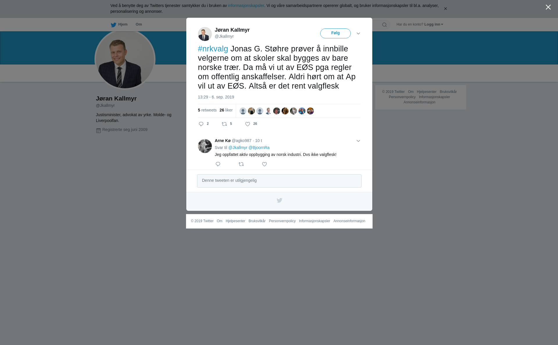 #nrkvalg Jonas G. Støhre prøver å innbille velgerne om at skoler skal bygges av bare norske trær. Da må vi ut av EØS pga regler om offentlig anskaffelser. Aldri hørt om at Ap vil ut av EØS. Altså er det rent valgflesk