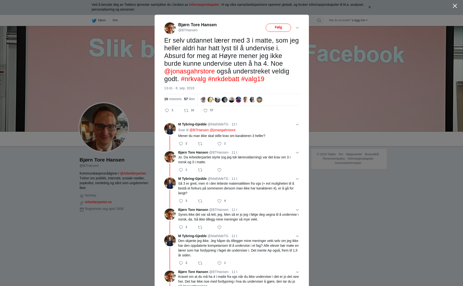 RT @BTHansen: Er selv utdannet lærer med 3 i matte, som jeg heller aldri har hatt lyst til å undervise i. Absurd for meg at Høyre mener jeg ikke burde kunne undervise uten å ha 4. Noe @jonasgahrstore også understreket veldig godt. #nrkvalg #nrkdebatt #valg19