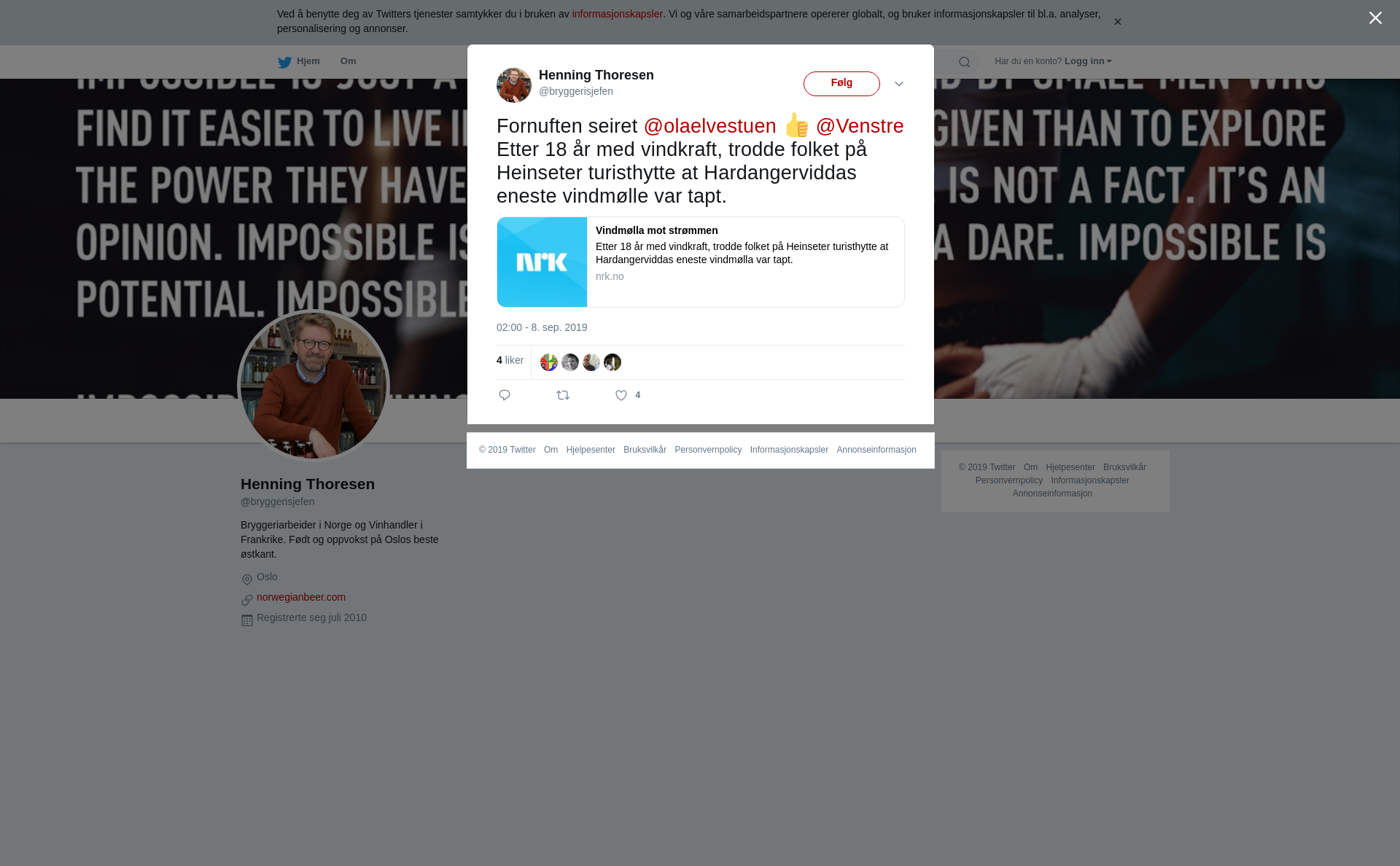 RT @bryggerisjefen: Fornuften seiret @olaelvestuen 👍 @Venstre Etter 18 år med vindkraft, trodde folket på Heinseter turisthytte at Har…