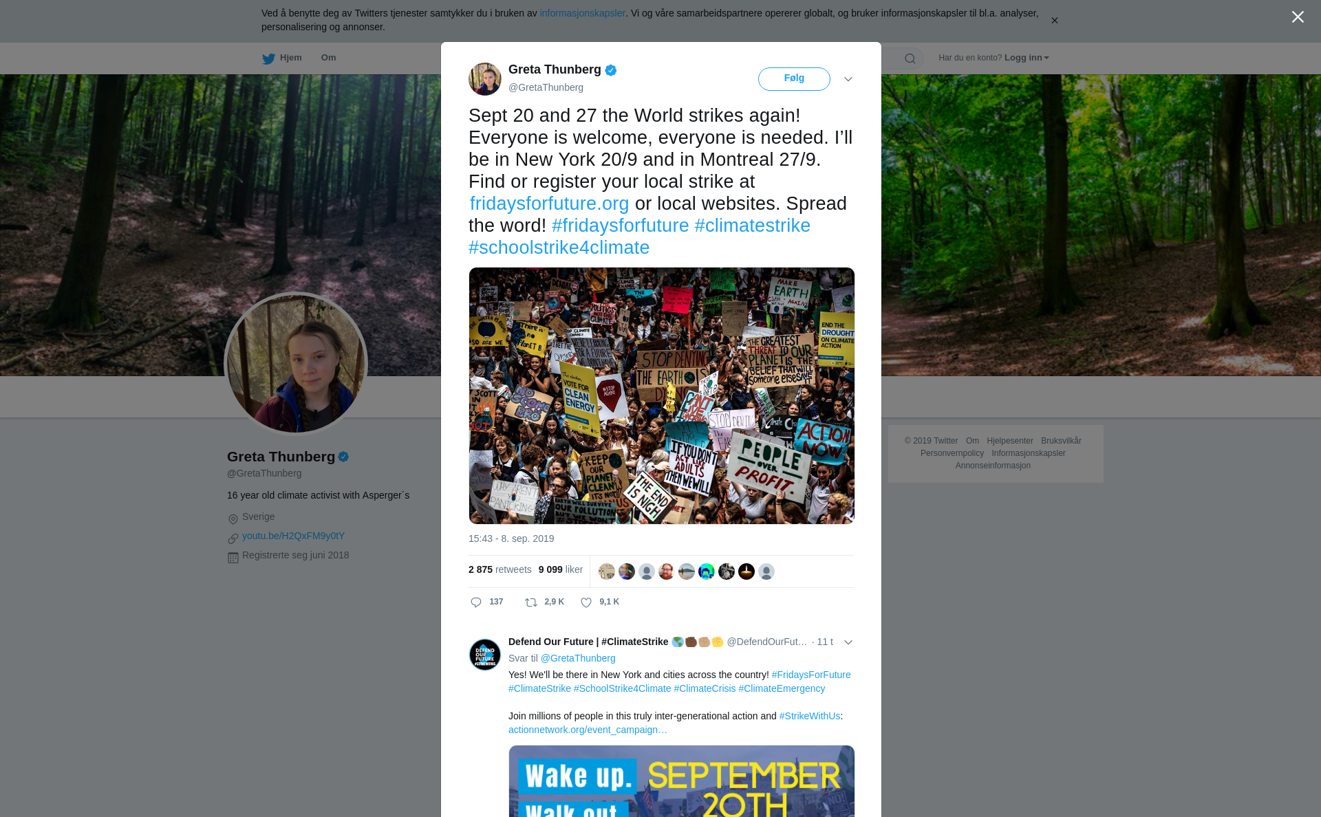 RT @GretaThunberg: Sept 20 and 27 the World strikes again! Everyone is welcome, everyone is needed. I’ll be in New York 20/9 and in Montreal 27/9. Find or register your local strike at https://t.co/G06WbXNvl1 or local websites. Spread the word! #fridaysforfuture #climatestrike #schoolstrike4climate https://t.co/BNI7ZywpsL