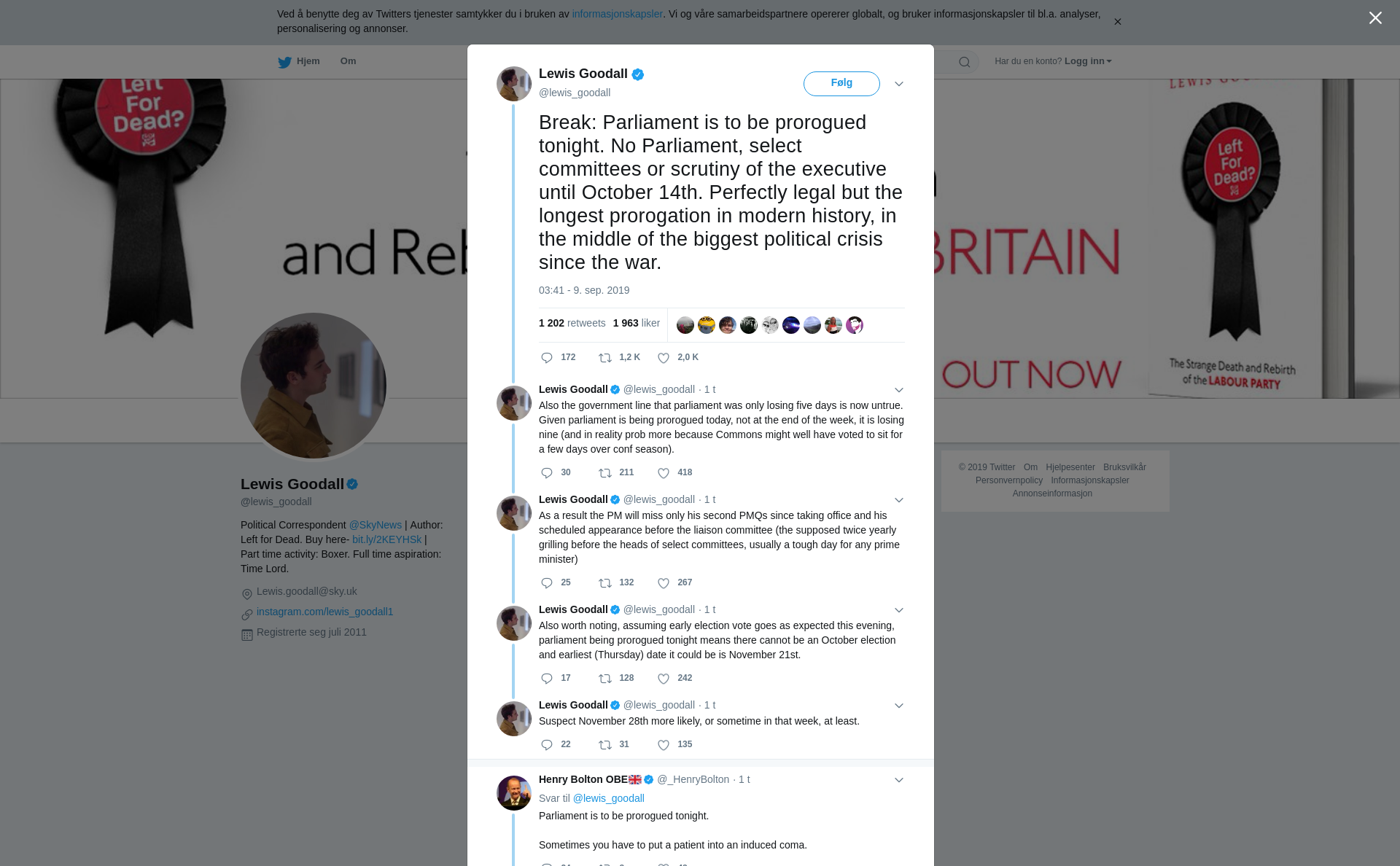 RT @lewis_goodall: Break: Parliament is to be prorogued tonight. No Parliament, select committees or scrutiny of the executive until October 14th. Perfectly legal but the longest prorogation in modern history, in the middle of the biggest political crisis since the war.