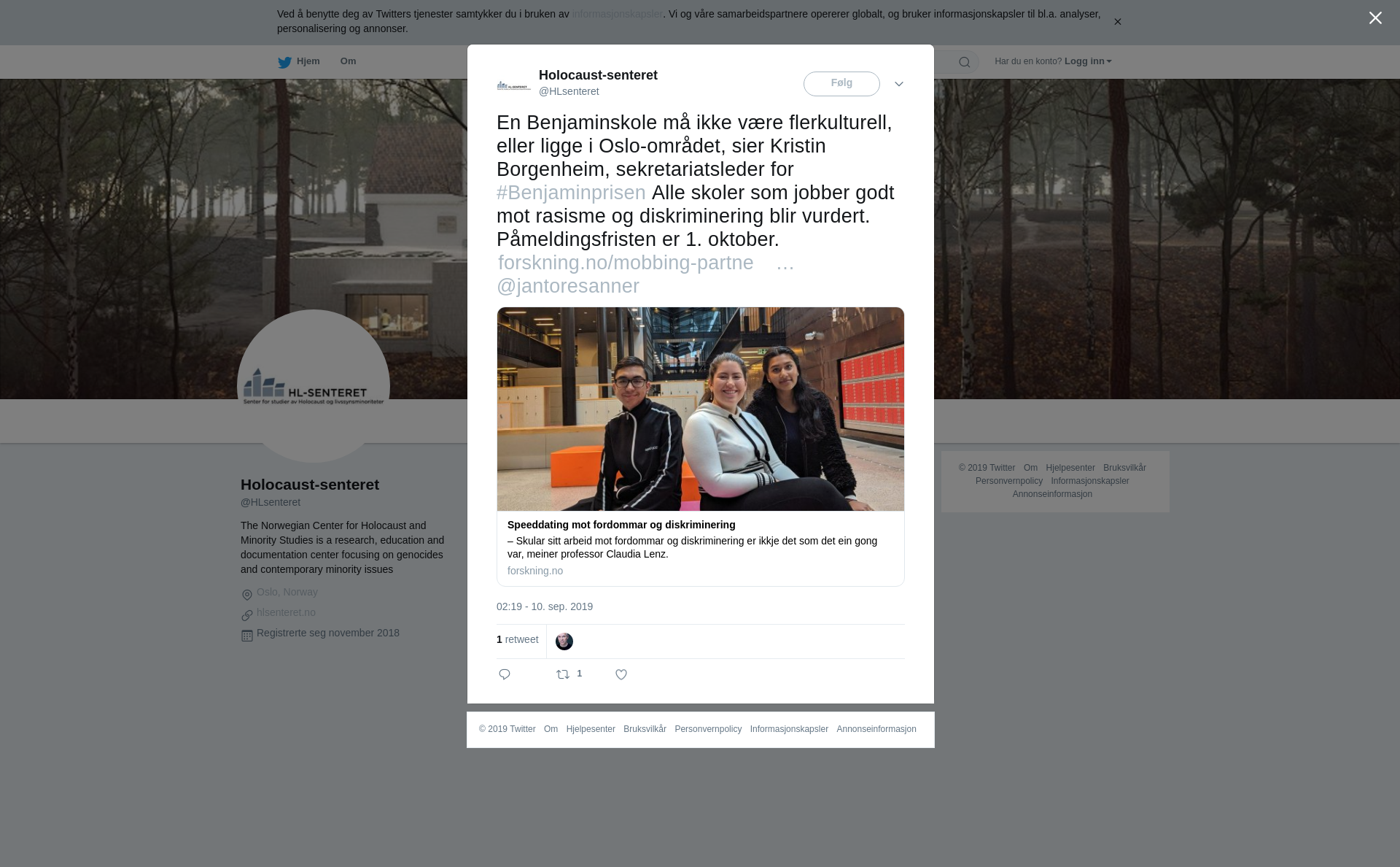 RT @HLsenteret: En Benjaminskole må ikke være flerkulturell, eller ligge i Oslo-området, sier Kristin Borgenheim, sekretariatsleder for #Benjaminprisen Alle skoler som jobber godt mot rasisme og diskriminering blir vurdert. Påmeldingsfristen er 1. oktober. https://t.co/u4d61w41yl @jantoresanner