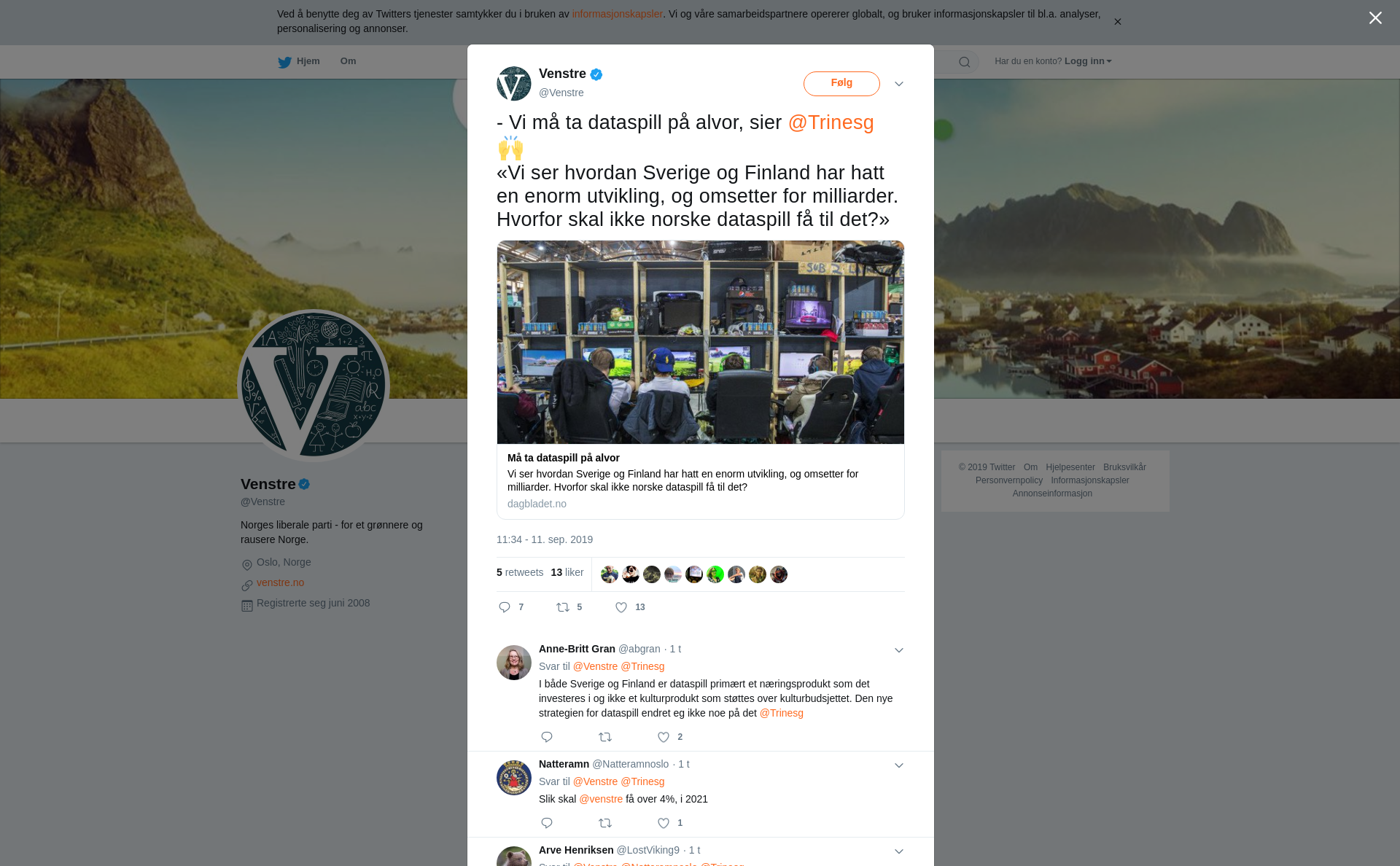 - Vi må ta dataspill på alvor, sier @Trinesg 🙌 «Vi ser hvordan Sverige og Finland har hatt en enorm utvikling, og omsetter for milliarder. Hvorfor skal ikke norske dataspill få til det?» https://t.co/fprUftqlTL
