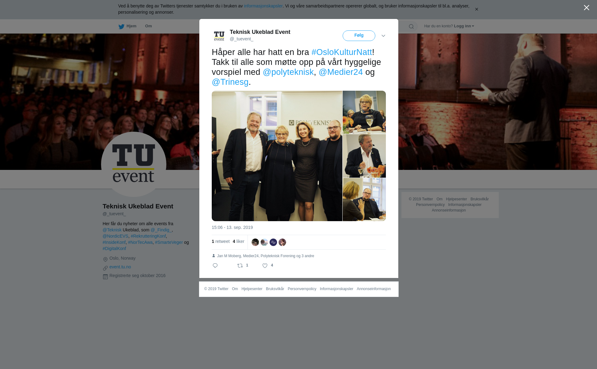 RT @_tuevent_: Håper alle har hatt en bra #OsloKulturNatt! Takk til alle som møtte opp på vårt hyggelige vorspiel med @polyteknisk, @Medier24 og @Trinesg. https://t.co/GIF5RRAcye