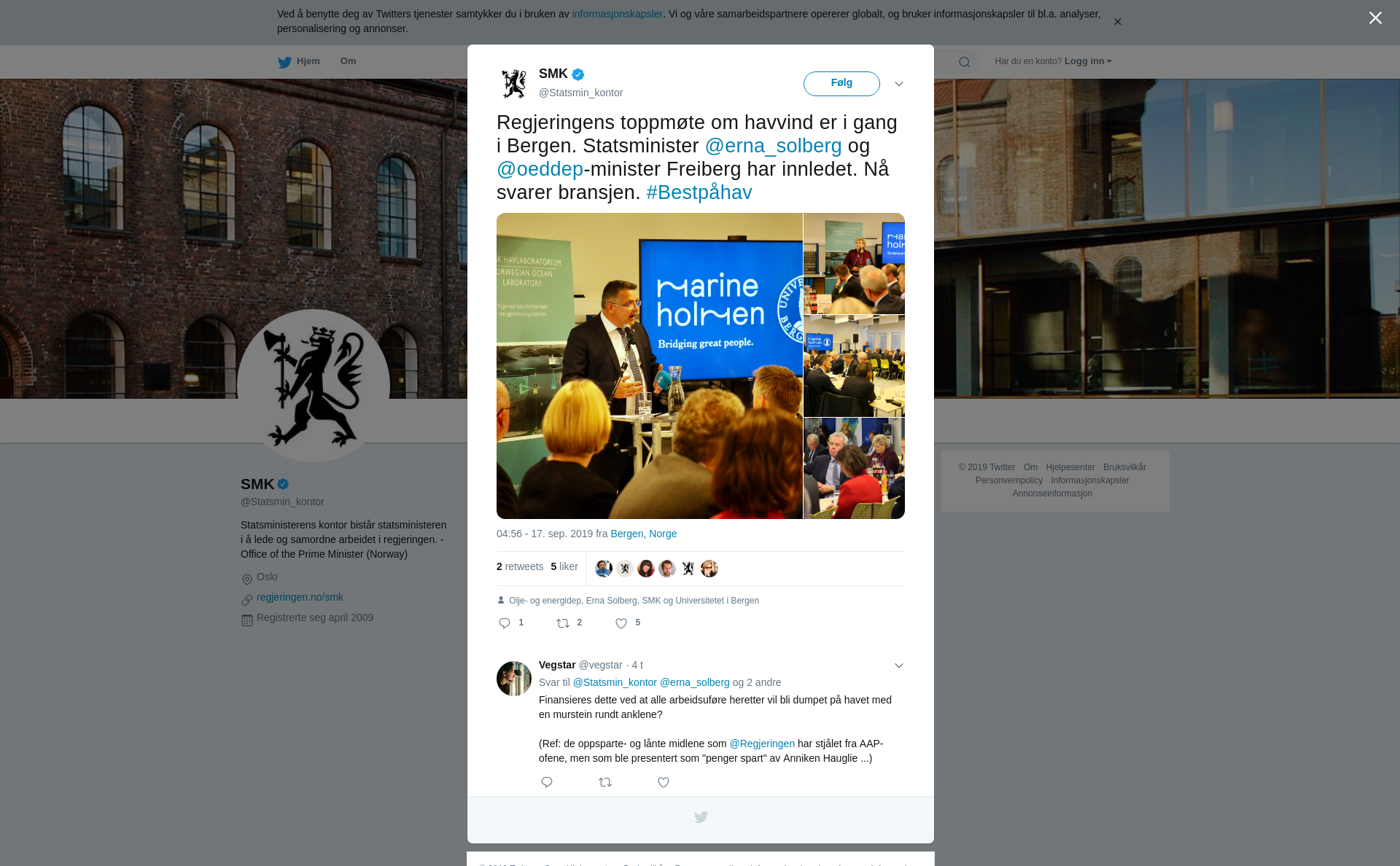 Regjeringens toppmøte om havvind er i gang i Bergen. Statsminister @erna_solberg og @oeddep-minister Freiberg har innledet. Nå svarer bransjen. #Bestpåhav https://t.co/u4RRZAMZeg