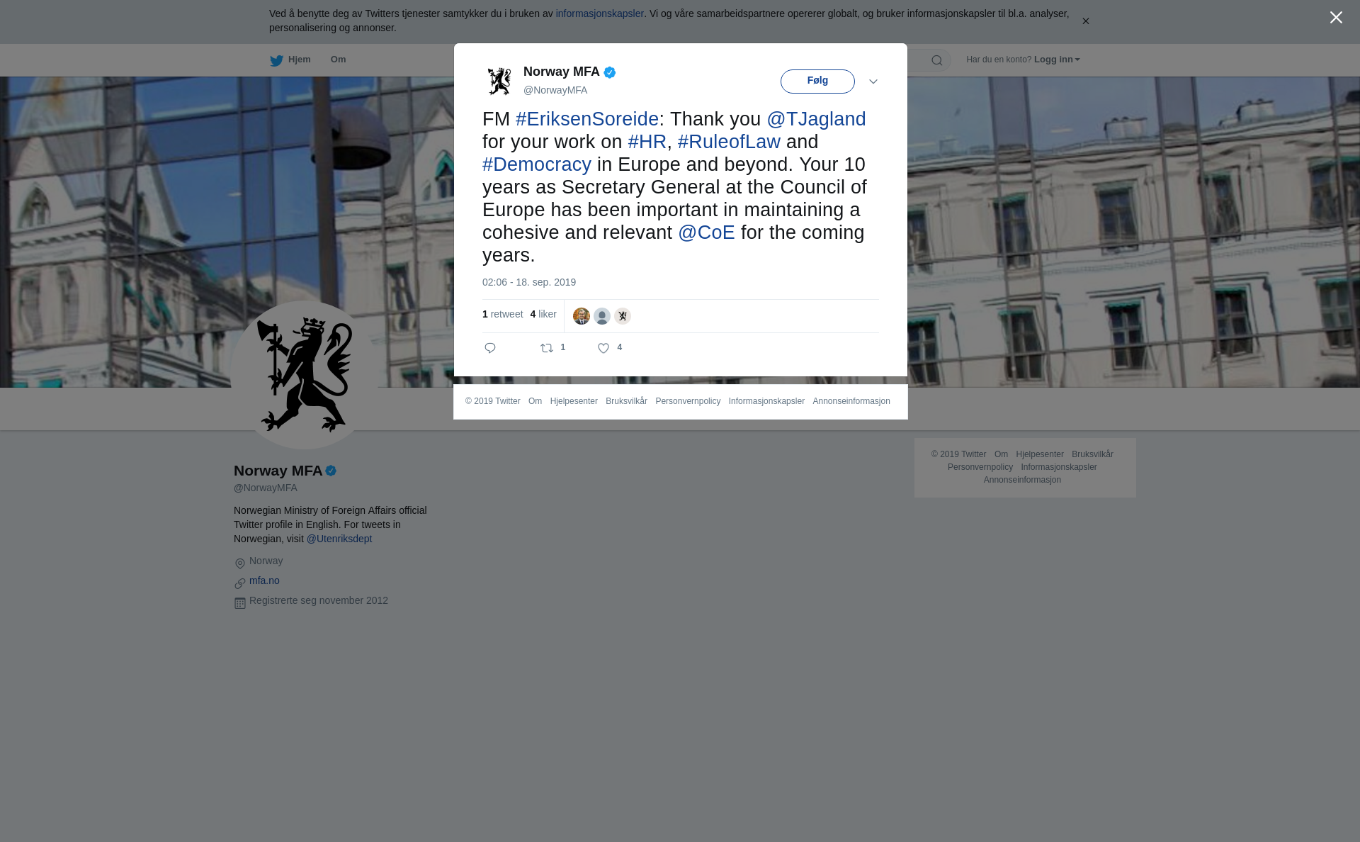 FM #EriksenSoreide: Thank you @TJagland for your work on #HR, #RuleofLaw and #Democracy in Europe and beyond. Your 10 years as Secretary General at the Council of Europe has been important in maintaining a cohesive and relevant @CoE for the coming years.