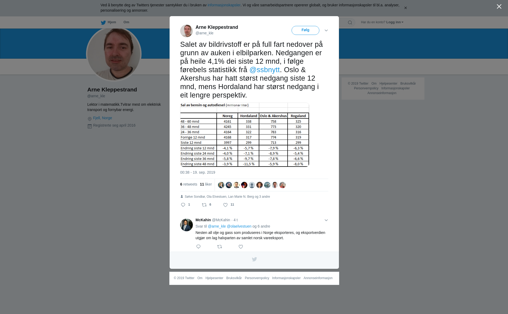 RT @arne_kle: Salet av bildrivstoff er på full fart nedover på grunn av auken i elbilparken. Nedgangen er på heile 4,1% dei siste 12 mnd, i følge førebels statistikk frå @ssbnytt. Oslo & Akershus har hatt størst nedgang siste 12 mnd, mens Hordaland har størst nedgang i eit lengre perspektiv. https://t.co/aO1FDiQEfB