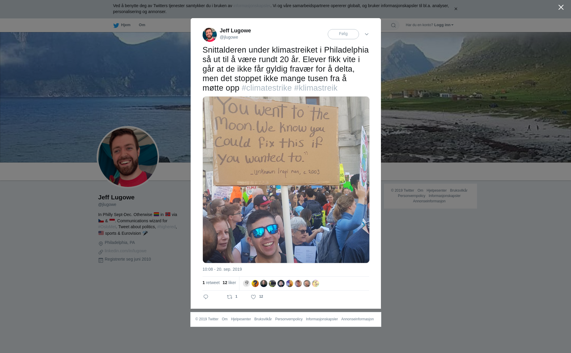RT @jlugowe: Snittalderen under klimastreiket i Philadelphia så ut til å være rundt 20 år. Elever fikk vite i går at de ikke får gyldig fravær for å delta, men det stoppet ikke mange tusen fra å møtte opp #climatestrike #klimastreik https://t.co/TzoIctRlAV