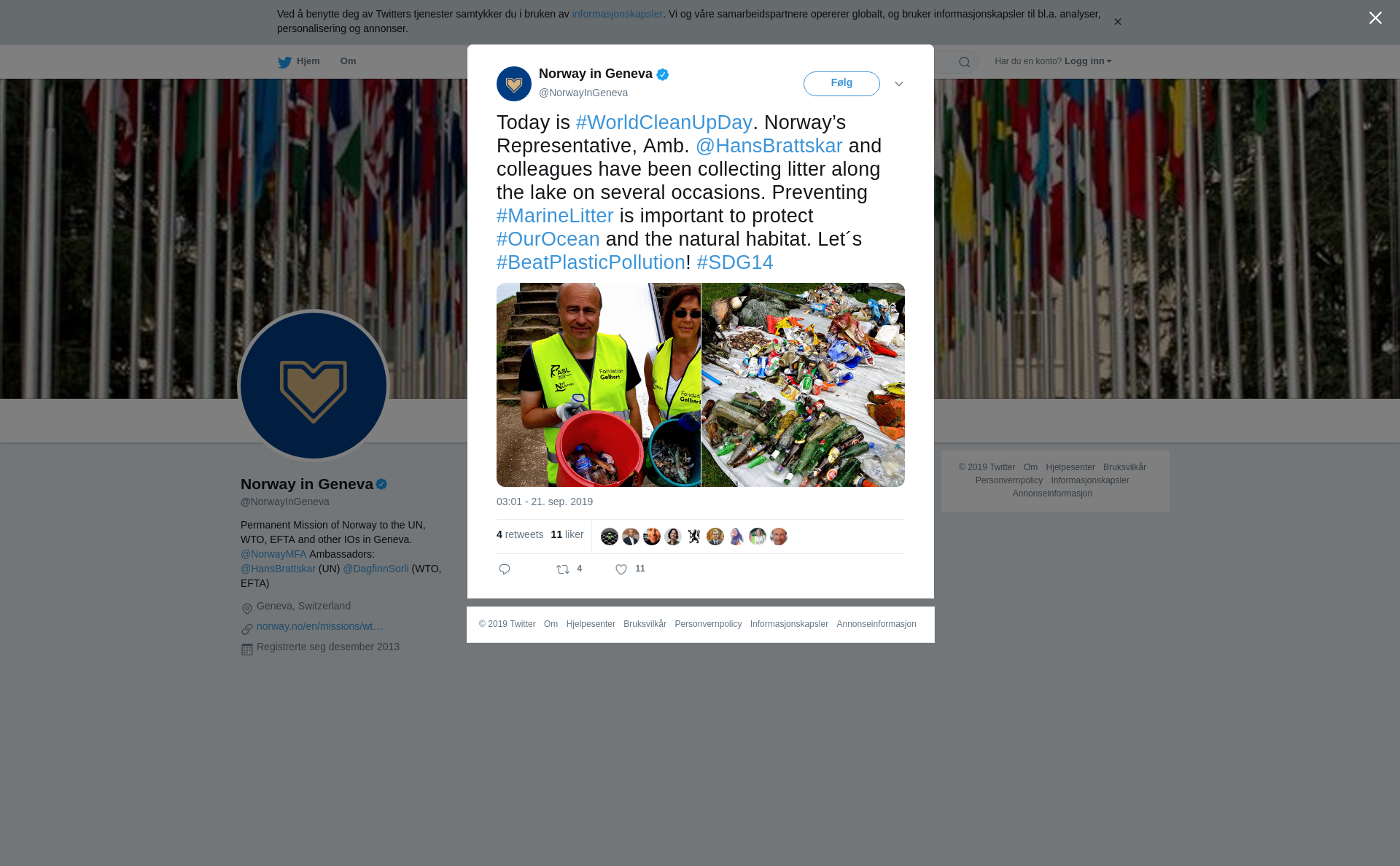 RT @NorwayInGeneva: Today is #WorldCleanUpDay. Norway’s Representative, Amb. @HansBrattskar and colleagues have been collecting litter along the lake on several occasions. Preventing #MarineLitter is important to protect #OurOcean and the natural habitat. Let´s #BeatPlasticPollution! #SDG14 https://t.co/kzcHW3GiJY