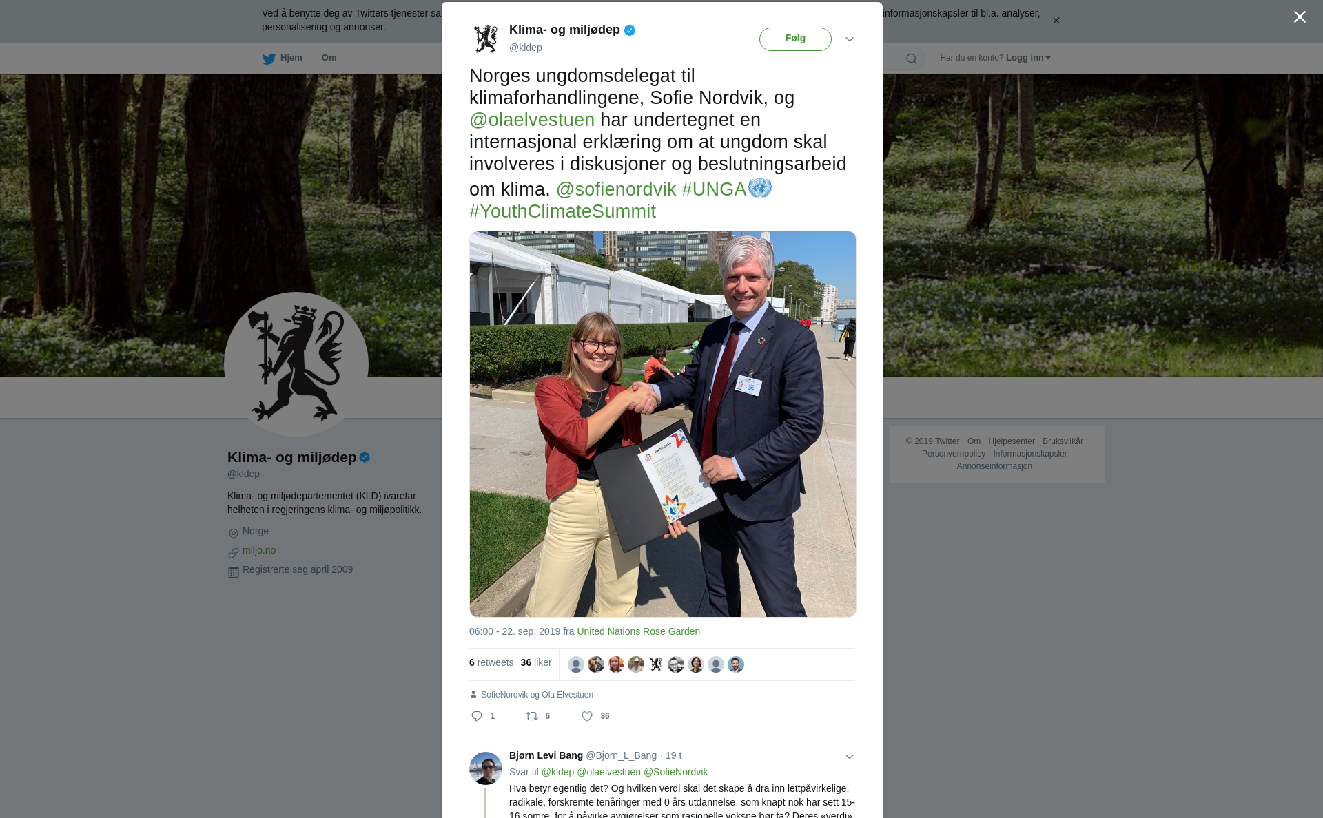 RT @kldep: Norges ungdomsdelegat til klimaforhandlingene, Sofie Nordvik, og @olaelvestuen har undertegnet en internasjonal erklæring om at ungdom skal involveres i diskusjoner og beslutningsarbeid om klima. @sofienordvik #UNGA #YouthClimateSummit https://t.co/gt4Jd4UYHk