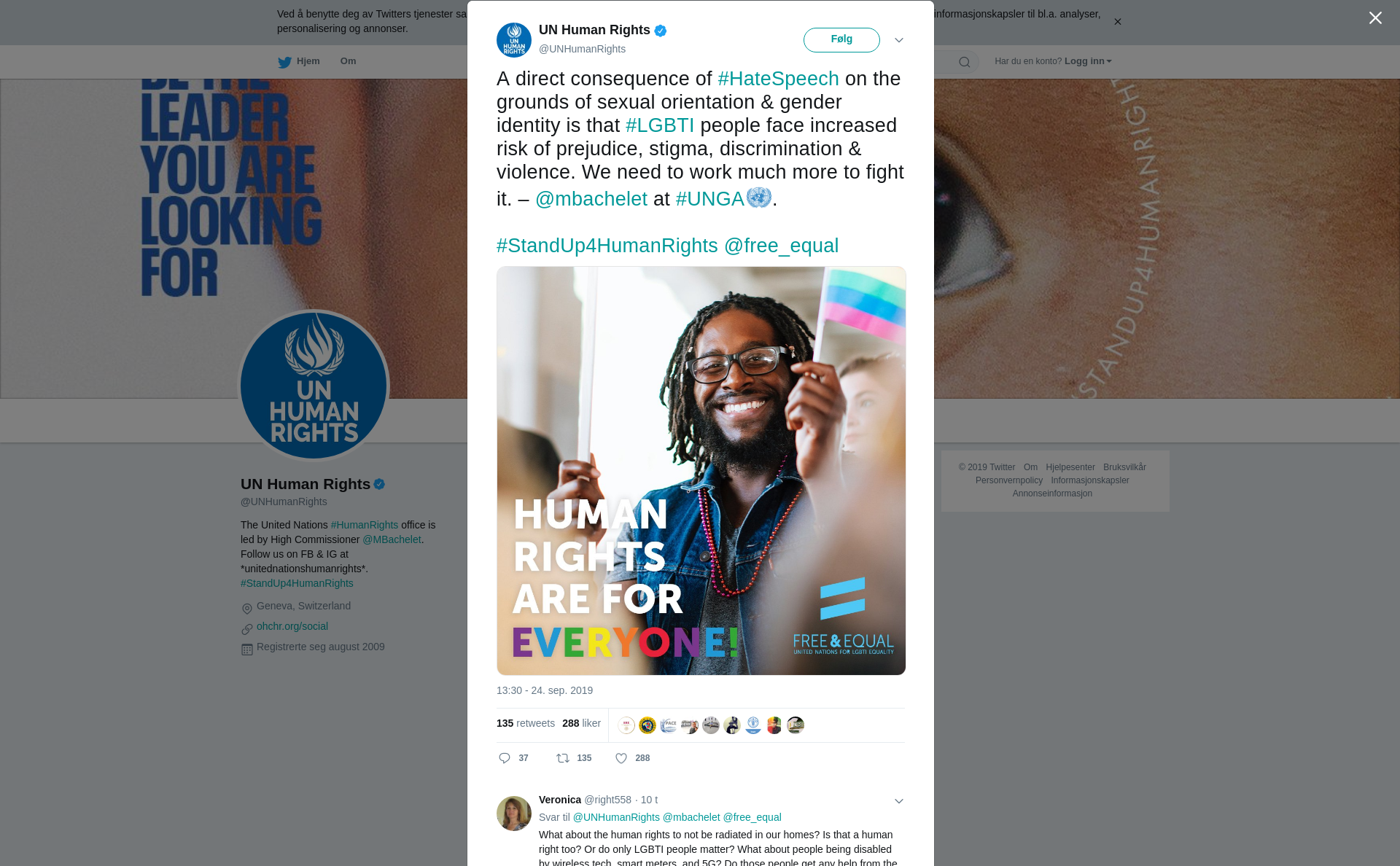 RT @UNHumanRights: A direct consequence of #HateSpeech on the grounds of sexual orientation & gender identity is that #LGBTI people face increased risk of prejudice, stigma, discrimination & violence. We need to work much more to fight it. – @mbachelet at #UNGA.