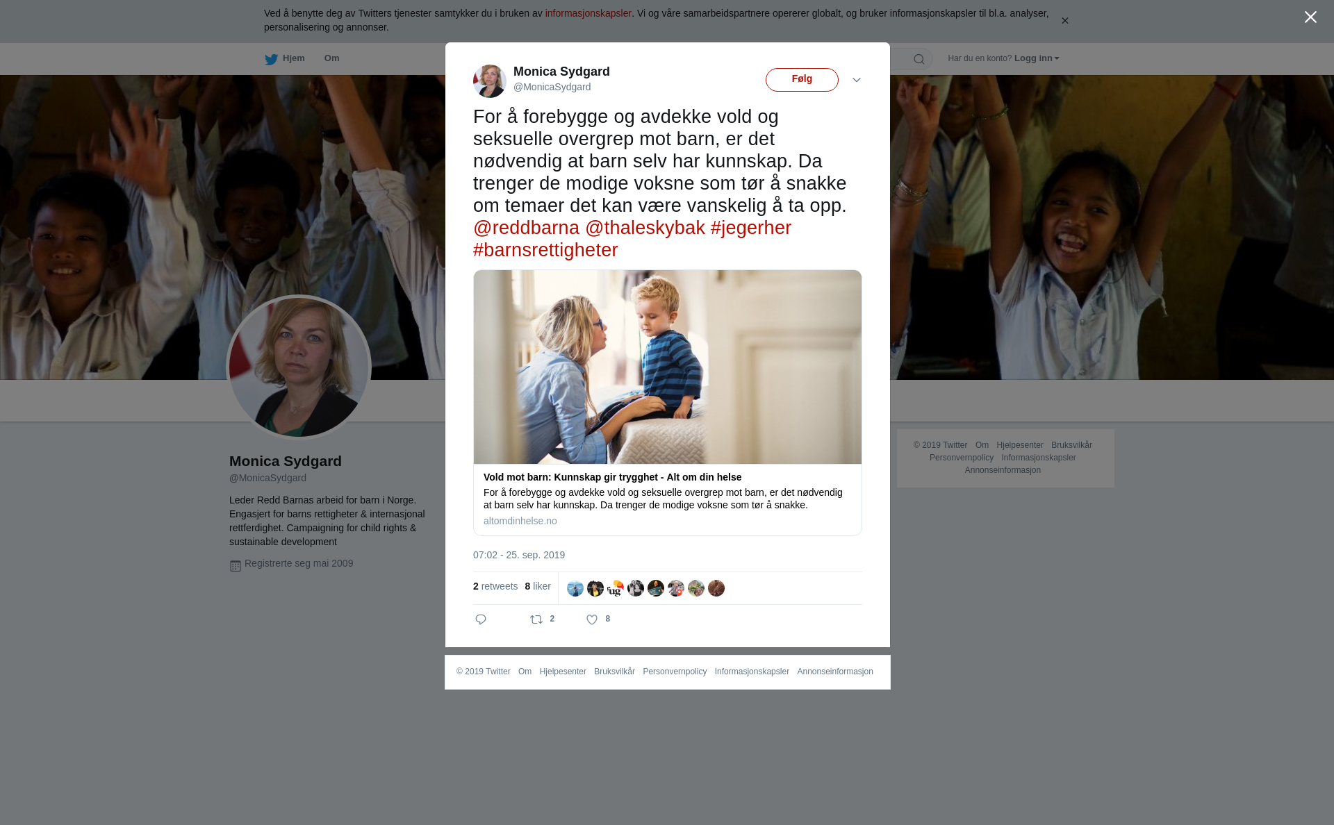 RT @MonicaSydgard: For å forebygge og avdekke vold og seksuelle overgrep mot barn, er det nødvendig at barn selv har kunnskap. Da trenger de modige voksne som tør å snakke om temaer det kan være vanskelig å ta opp. @reddbarna @thaleskybak #jegerher #barnsrettigheter https://t.co/JzYmEebQUL