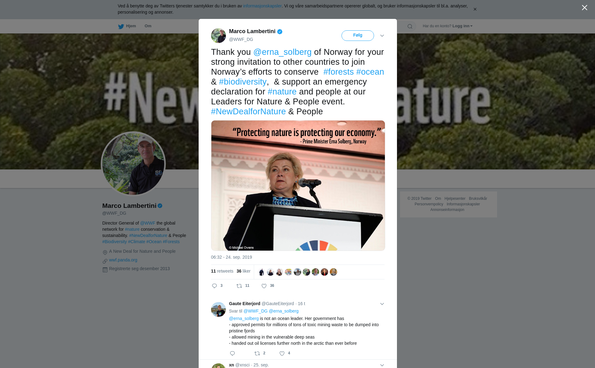 RT @WWF_DG: Thank you @erna_solberg of Norway for your strong invitation to other countries to join Norway’s efforts to conserve #forests #ocean & #biodiversity, & support an emergency declaration for #nature and people at our Leaders for Nature & People event.