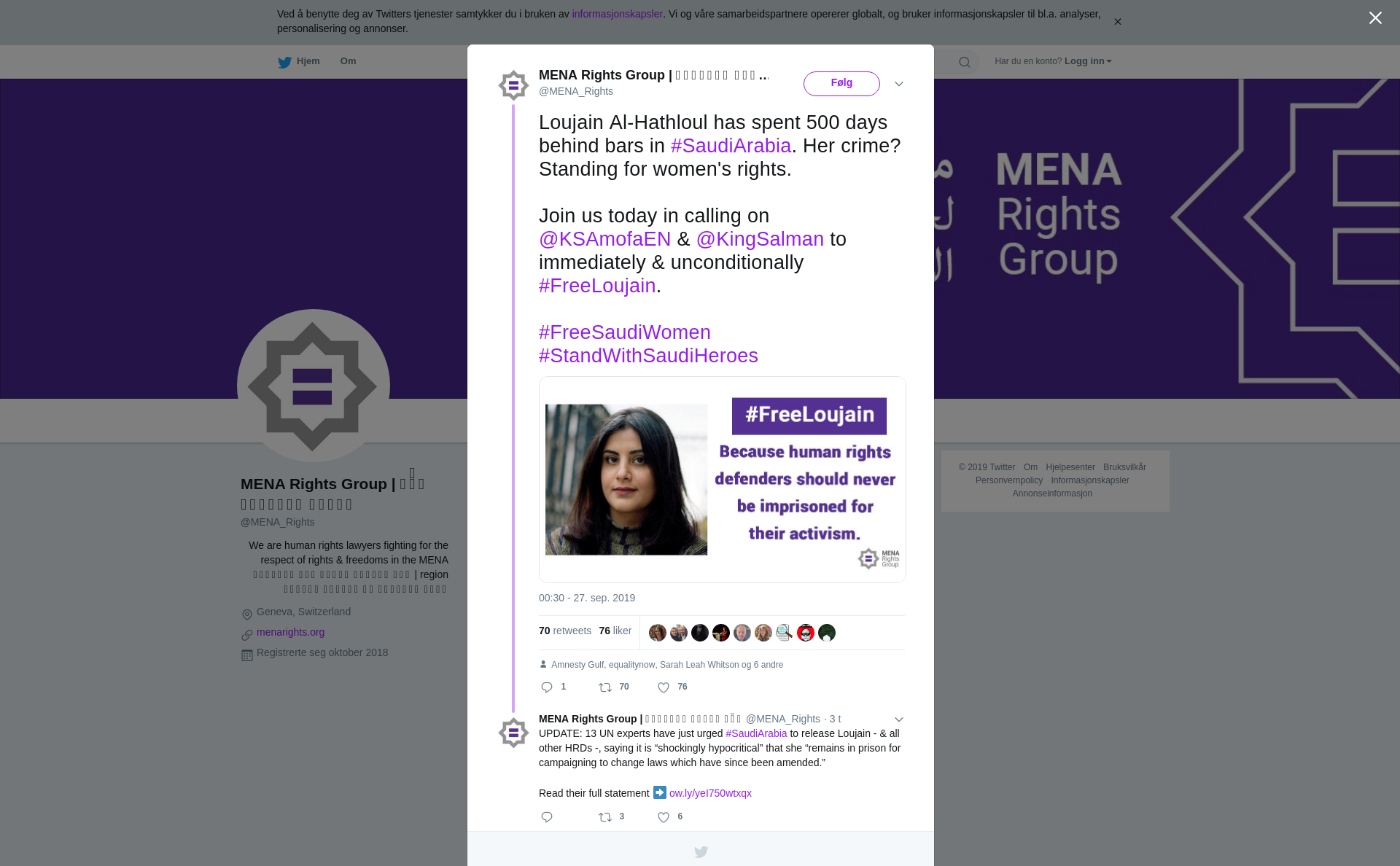 RT @MENA_Rights: Loujain Al-Hathloul has spent 500 days behind bars in #SaudiArabia. Her crime? Standing for women's rights. Join us today…