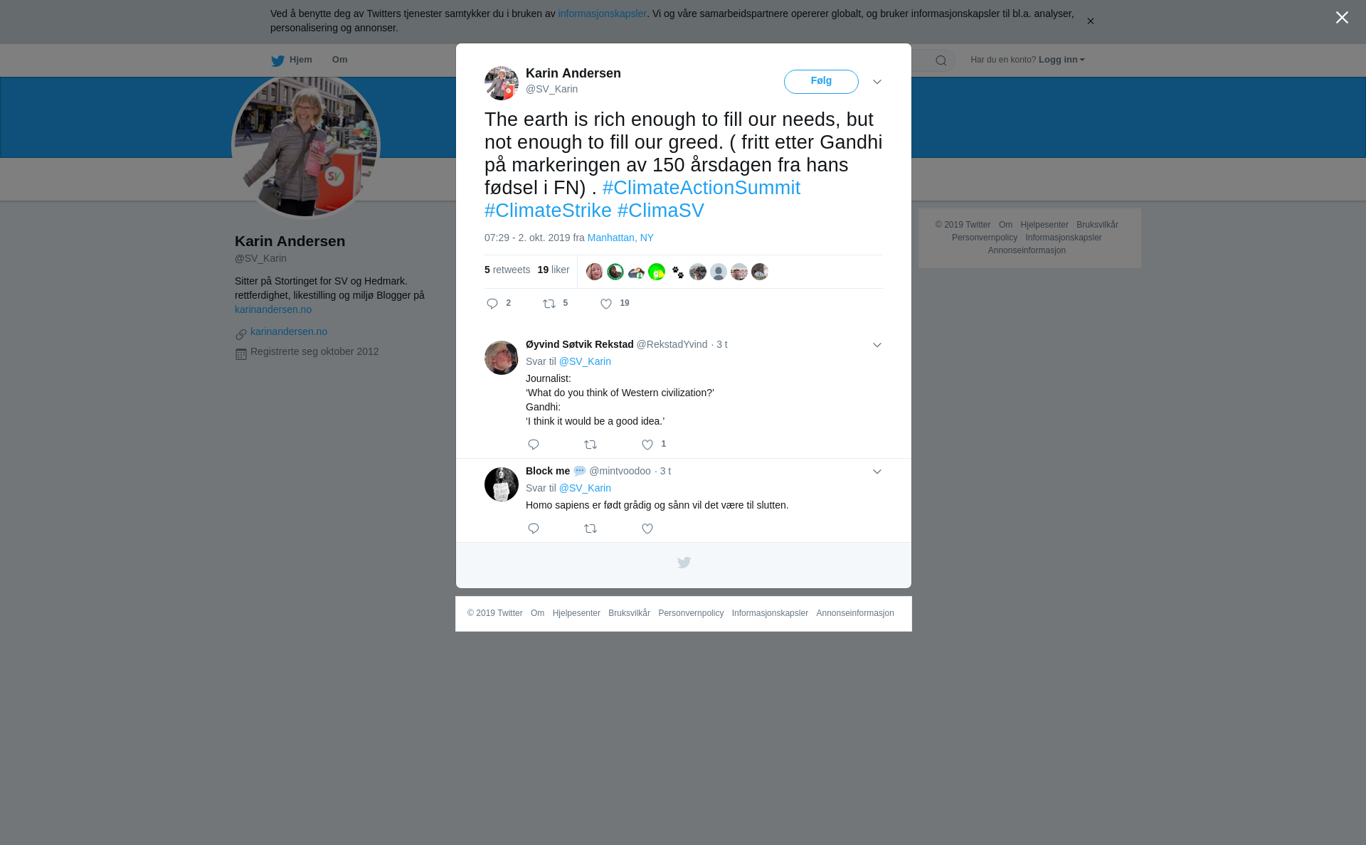 The earth is rich enough to fill our needs, but not enough to fill our greed. ( fritt etter Gandhi på markeringen av 150 årsdagen fra hans fødsel i FN) . #ClimateActionSummit #ClimateStrike #ClimaSV