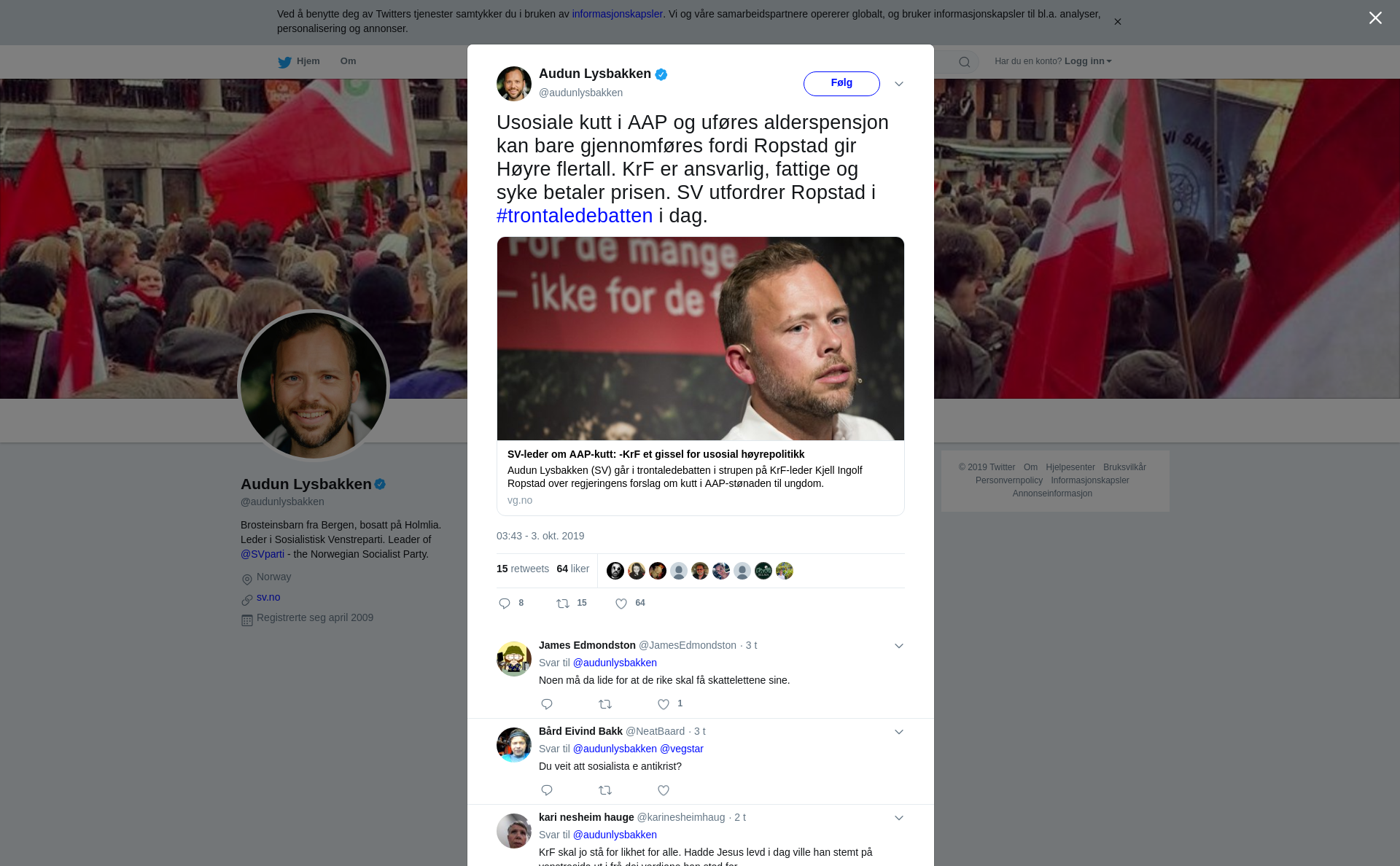 Usosiale kutt i AAP og uføres alderspensjon kan bare gjennomføres fordi Ropstad gir Høyre flertall. KrF er ansvarlig, fattige og syke betaler prisen. SV utfordrer Ropstad i #trontaledebatten i dag. https://t.co/BxVnuLu8lF