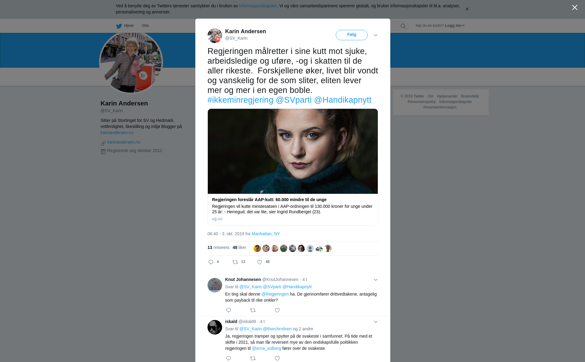 Regjeringen målretter i sine kutt mot sjuke, arbeidsledige og uføre, -og i skatten til de aller rikeste. Forskjellene øker, livet blir vondt og vanskelig for de som sliter, eliten lever mer og mer i en egen boble. #ikkeminregjering @SVparti @Handikapnytt https://t.co/59BUDPCuuP